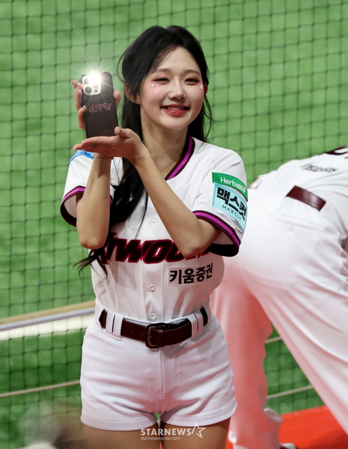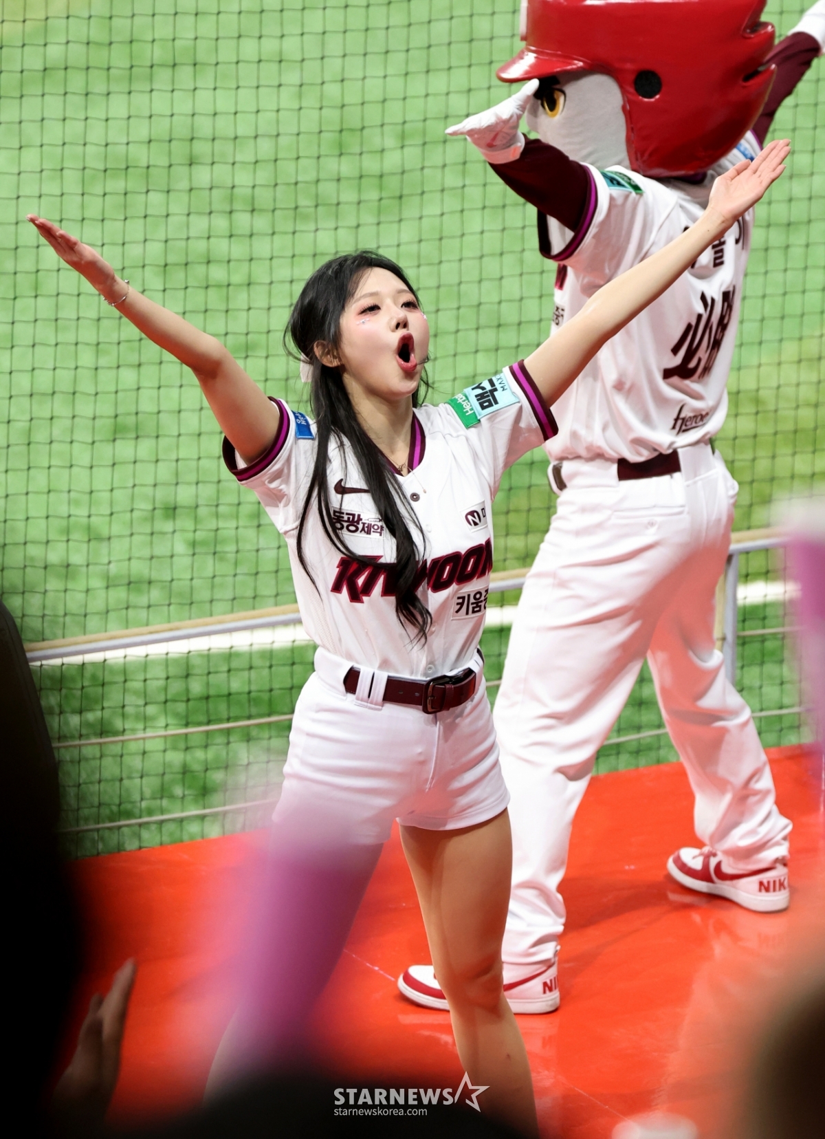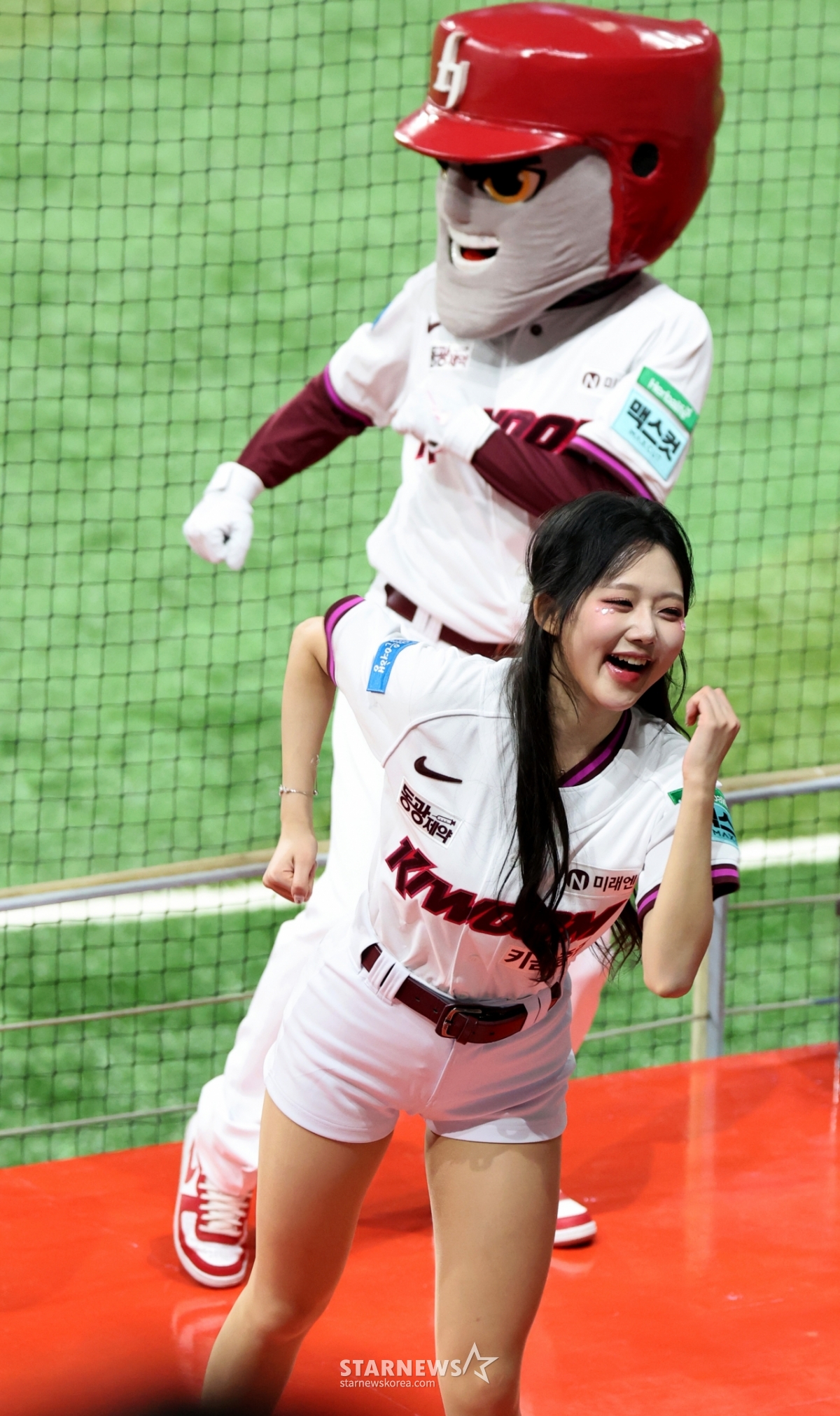 Kiwoom cheerleader Kang Soo-kyung is cheering enthusiastically in the 2026 KBO League Kiwoom Heroes and LG Twins match at Gocheok Sky Dome.