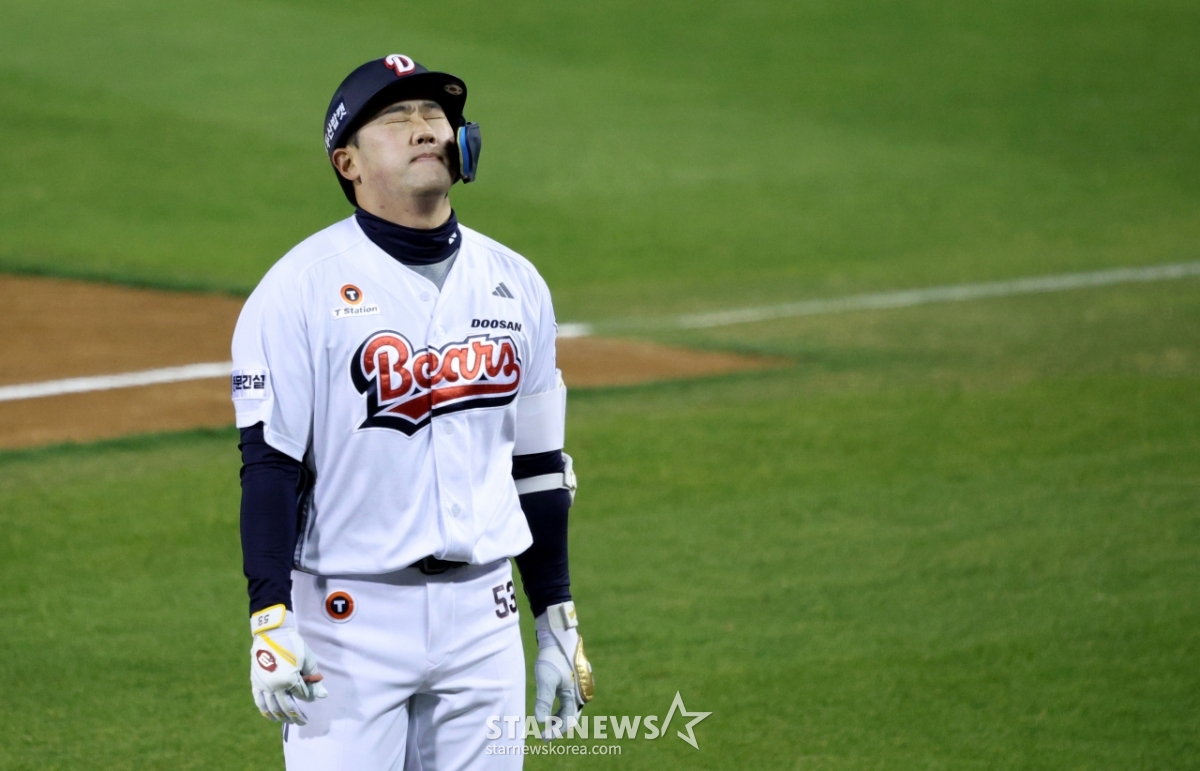Yang Seok-hwan of the Doosan Bears is regretful when his determined ball with the bases loaded with one out in the bottom of the fourth inning ended up being a tiebreaking RBI sacrifice fly.