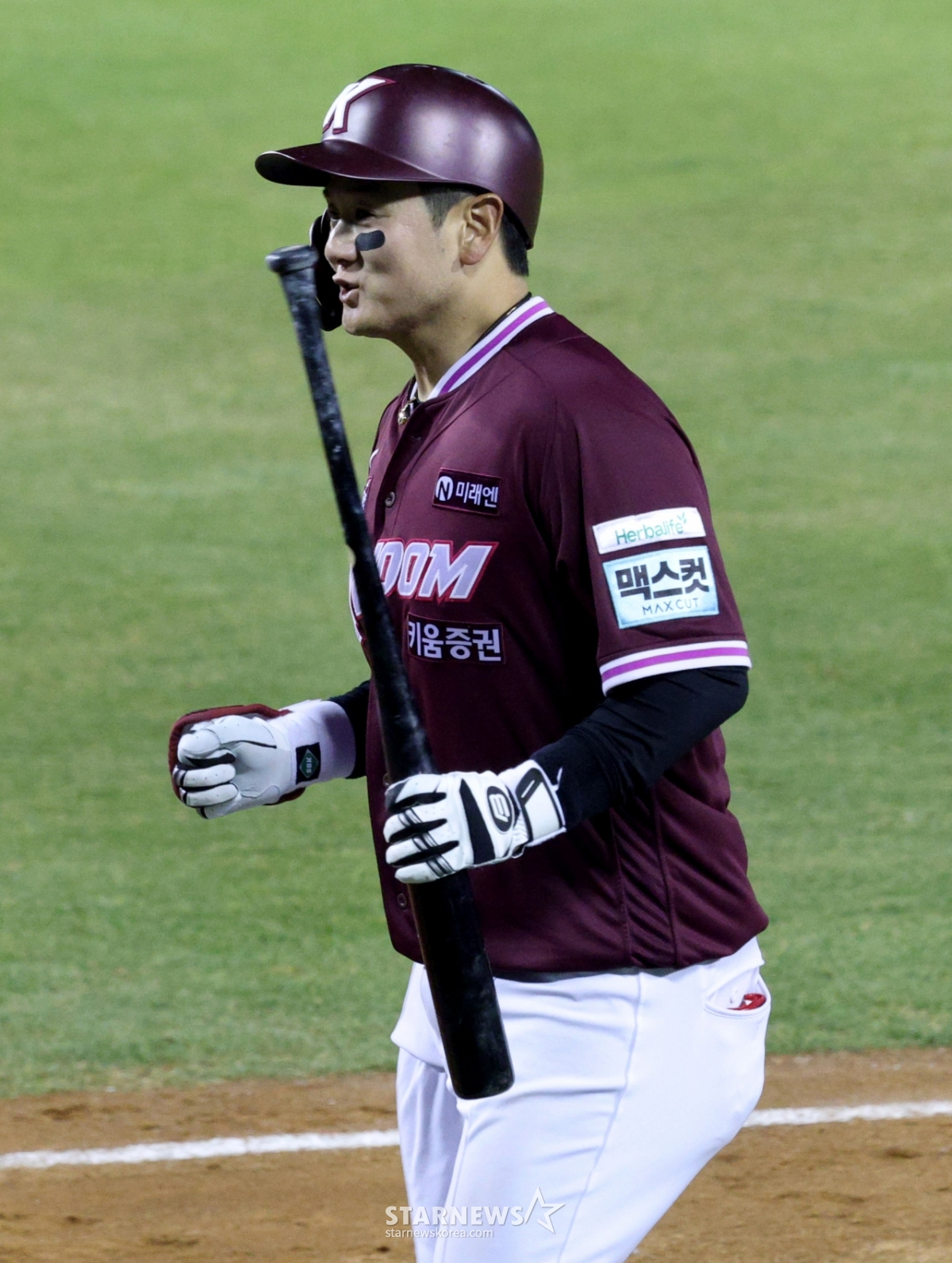 Kiwoom Choi Joo-hwan is heading to the dugout with a bright look after hitting an RBI sacrifice fly with the bases loaded with one out in the top of the seventh inning.