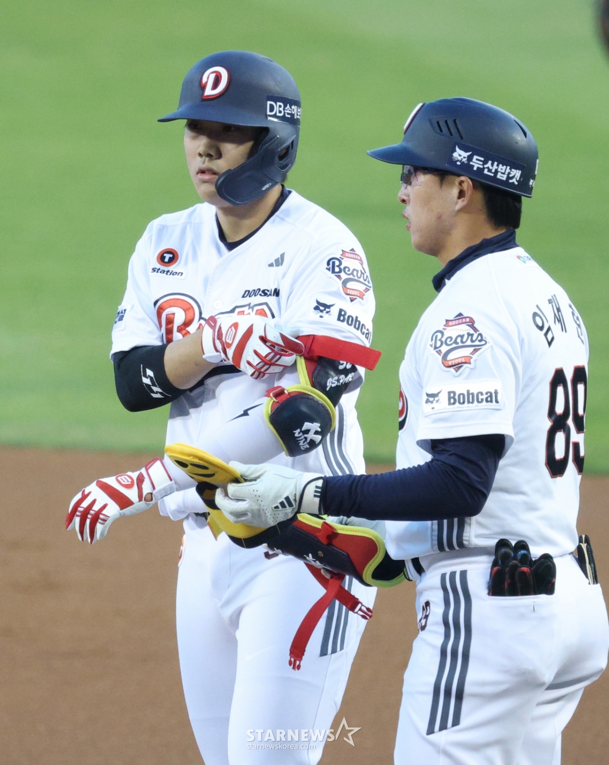 Doosan Bears' Park Joon-soon is celebrating after hitting a timely first RBI with one out and second base in the bottom of the first inning.