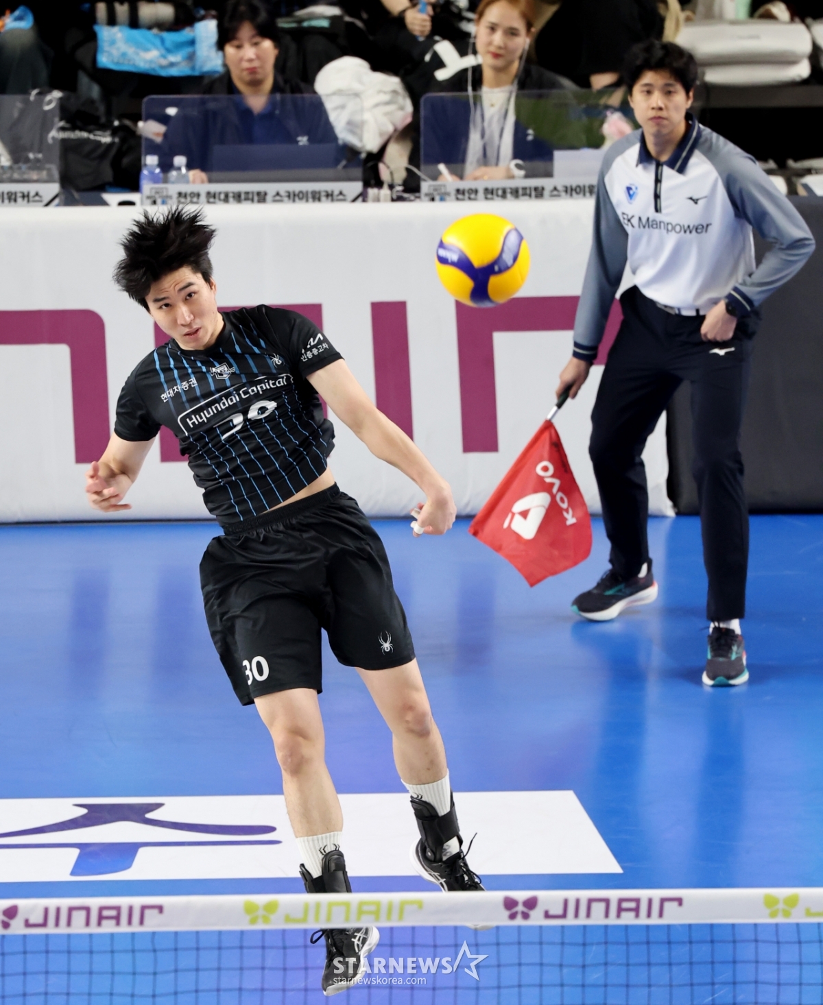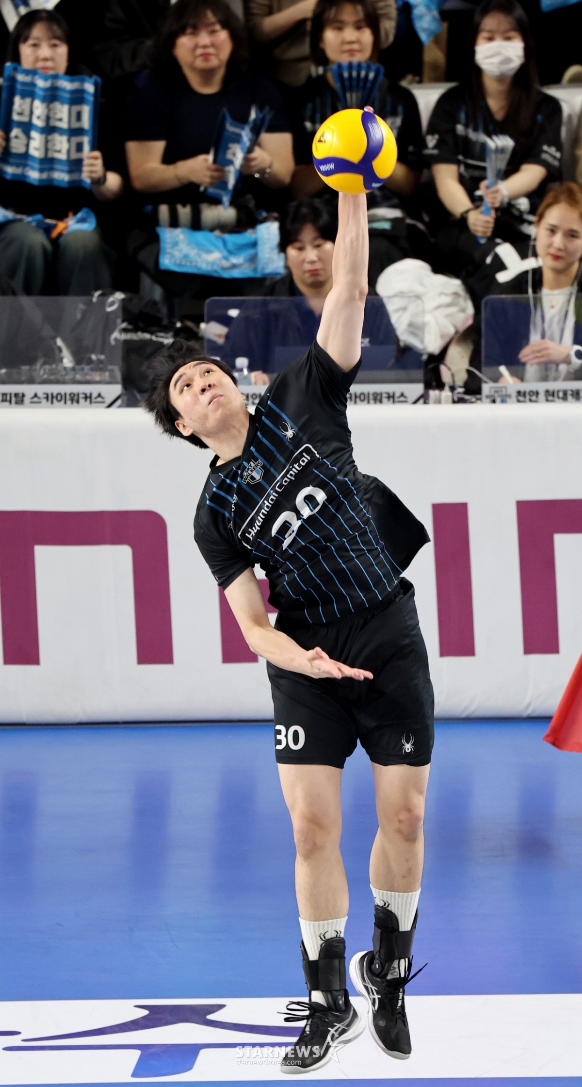 Hyundai Shin Chan-jin is attempting a strong spike serve in the fourth round of the Jin Air 2025-2026 V-League championship match between Korean Air and Hyundai Capital at Cheonan Yoo Gwan-soon Gymnasium on the 8th. 2026.04.08.