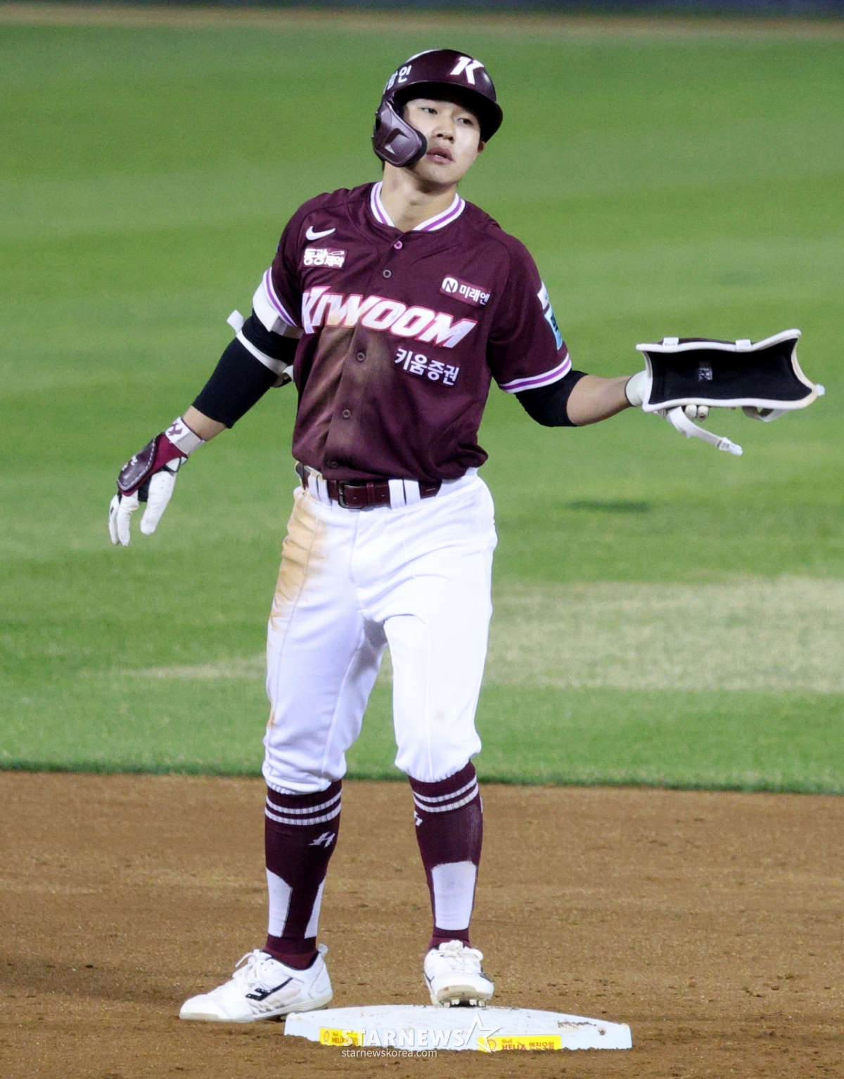 Kiwoom Park Han-kyul is celebrating after hitting a superior double with two outs in the top of the fifth inning.