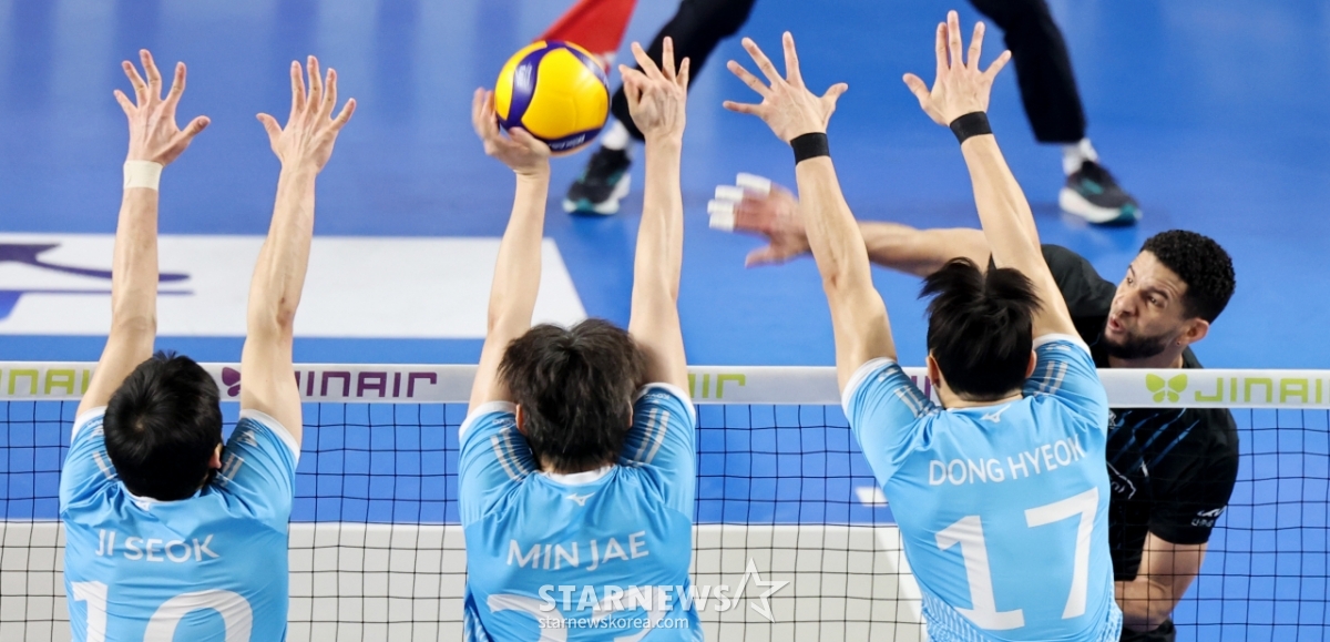 Hyundai Leo is hitting Korean Air's triple blocking in the fourth round of the Jin Air 2025-2026 V-League championship match between Korean Air and Hyundai Capital at Cheonan Yu Gwan-soon Gymnasium on the 8th. 2026.04.08.