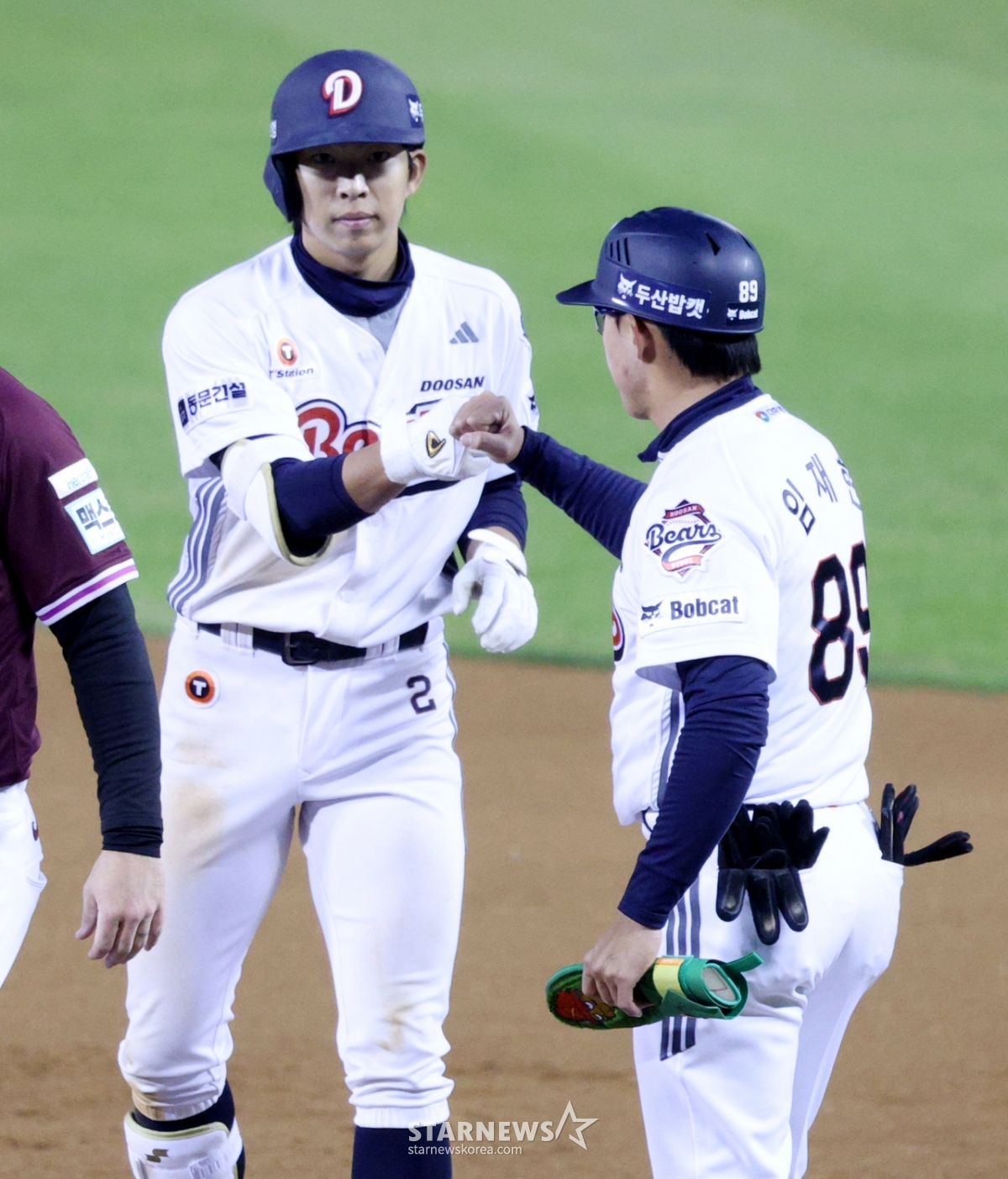 Doosan's Kim Min-seok is welcomed by coach Lim Jae-hyun after hitting a timely two-run hit with the bases loaded with no outs in the bottom of the seventh inning.