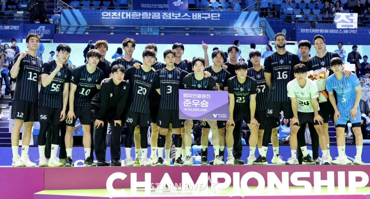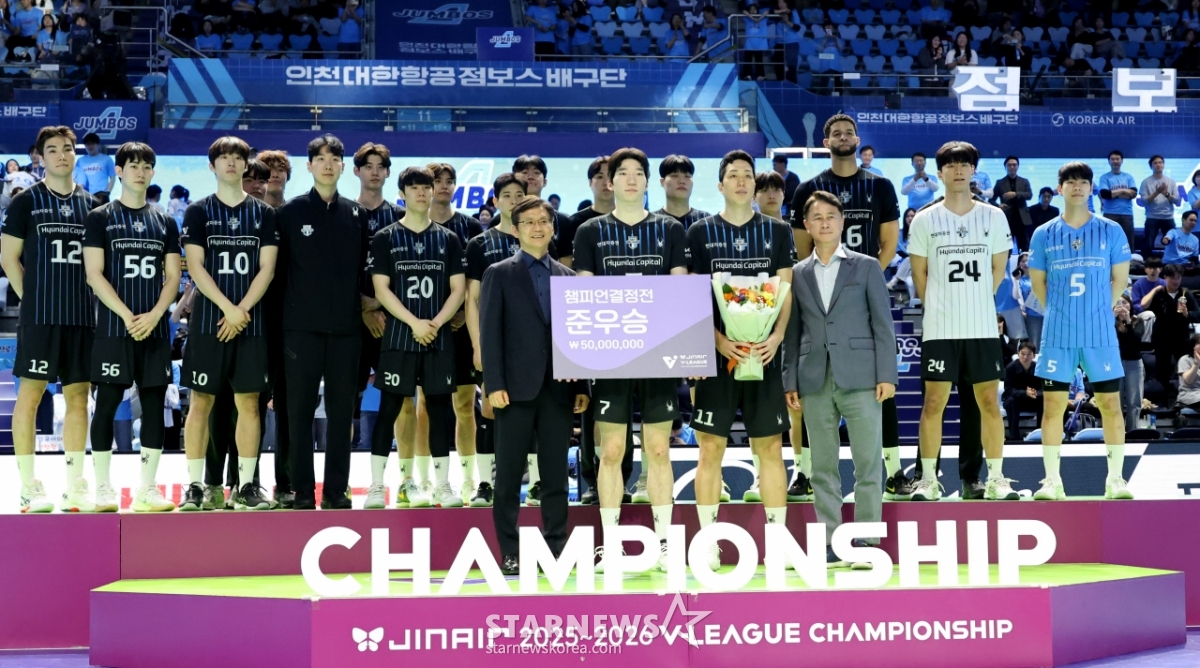 Heo Soo-bong and Leo of Hyundai Capital, who are runners-up, are winning the Red Card by winning the plaque after losing the fifth game of the Jin Air 2025-2026 V-League championship match against Korean Air at Gyeyang Gymnasium in Incheon on the 10th. 2026.04.10.