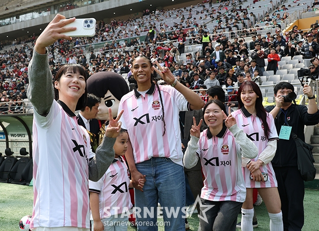 GS Caltex's Yoo So-yeon and Silva, who won the women's volleyball championship, are taking commemorative photos after asking FC Seoul to win for the event.