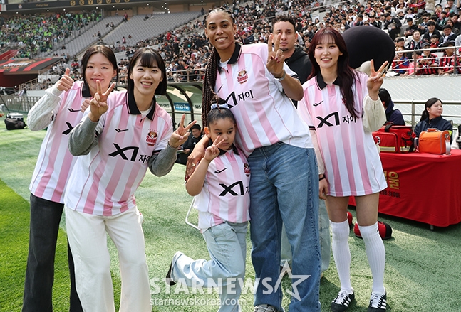 GS Caltex's Yoo So-yeon and Silva, who won the women's volleyball championship, are taking commemorative photos after asking FC Seoul to win for the event.