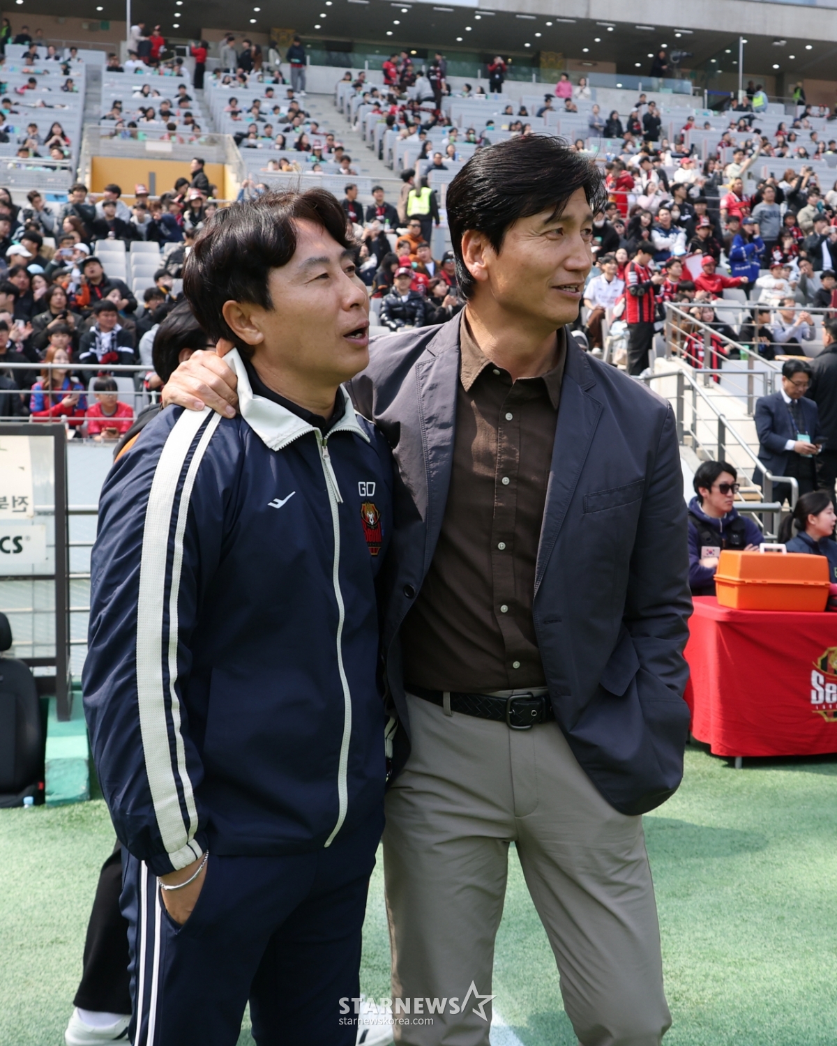 Jeonbuk Hyundai head coach Chung Jung-yong greets FC Seoul head coach Kim Ki-dong, vowing to do well.