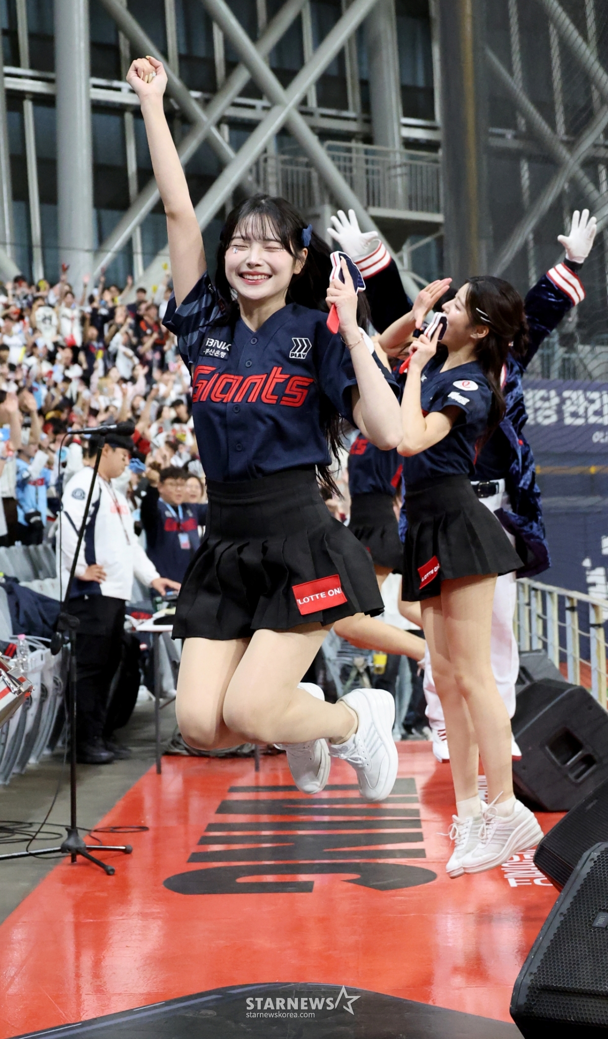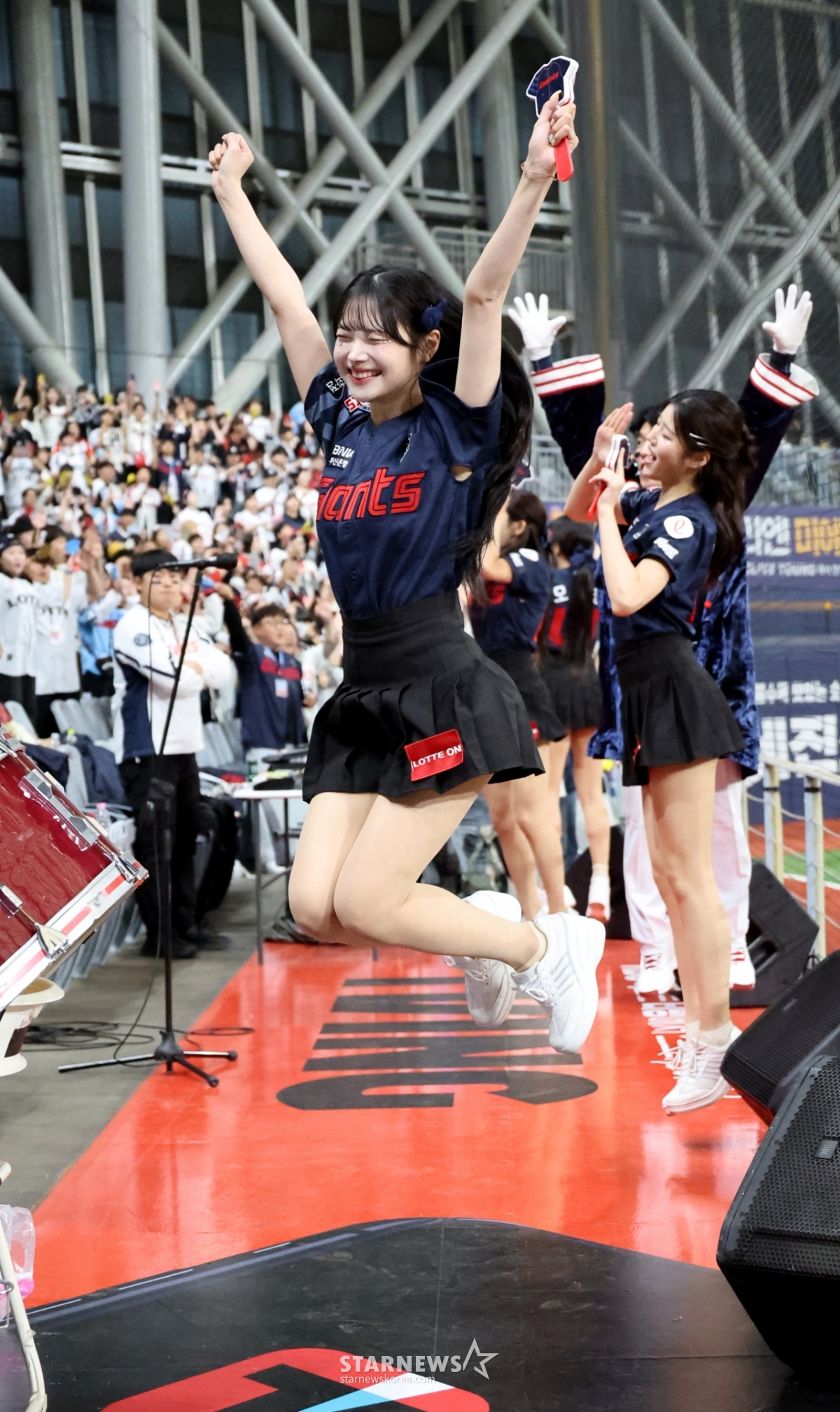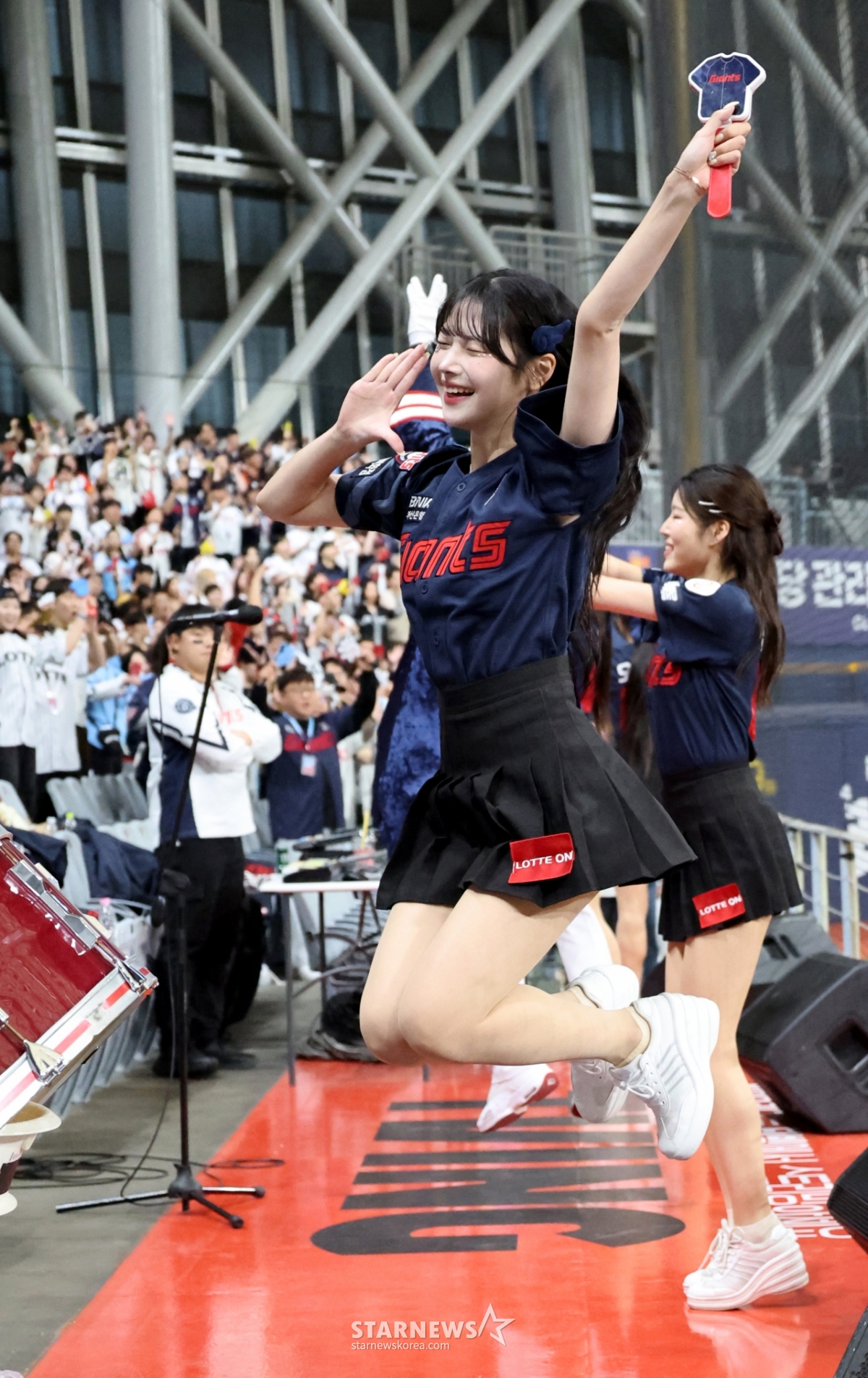 Lotte cheerleader Lee Jo-eun is cheering after a hit opened in the top of the eighth inning of the 2026 KBO League game between the Lotte Giants and the Kiwoom Heroes at Gocheok Sky Dome on the 12th.. 2026.04.12.