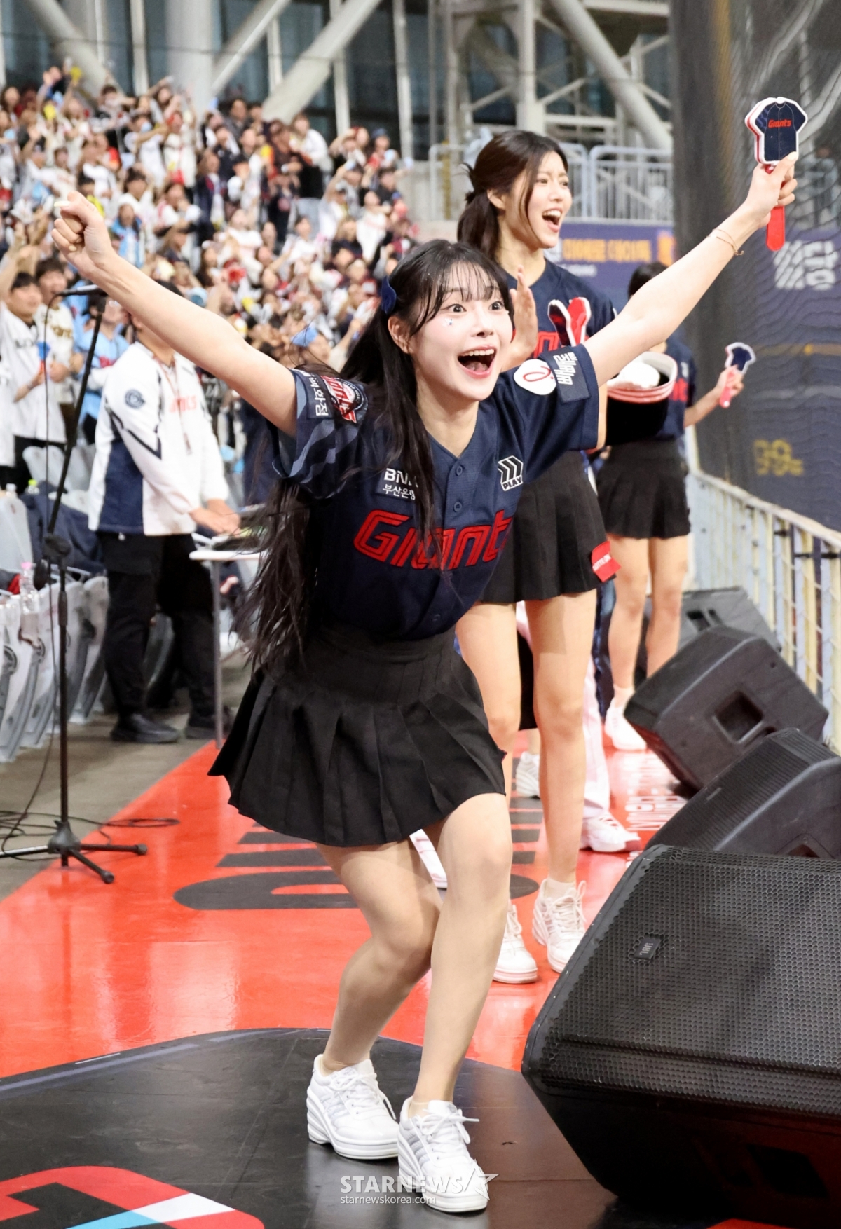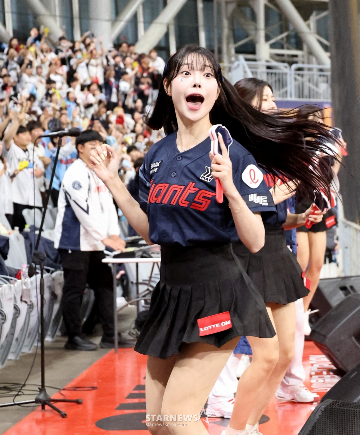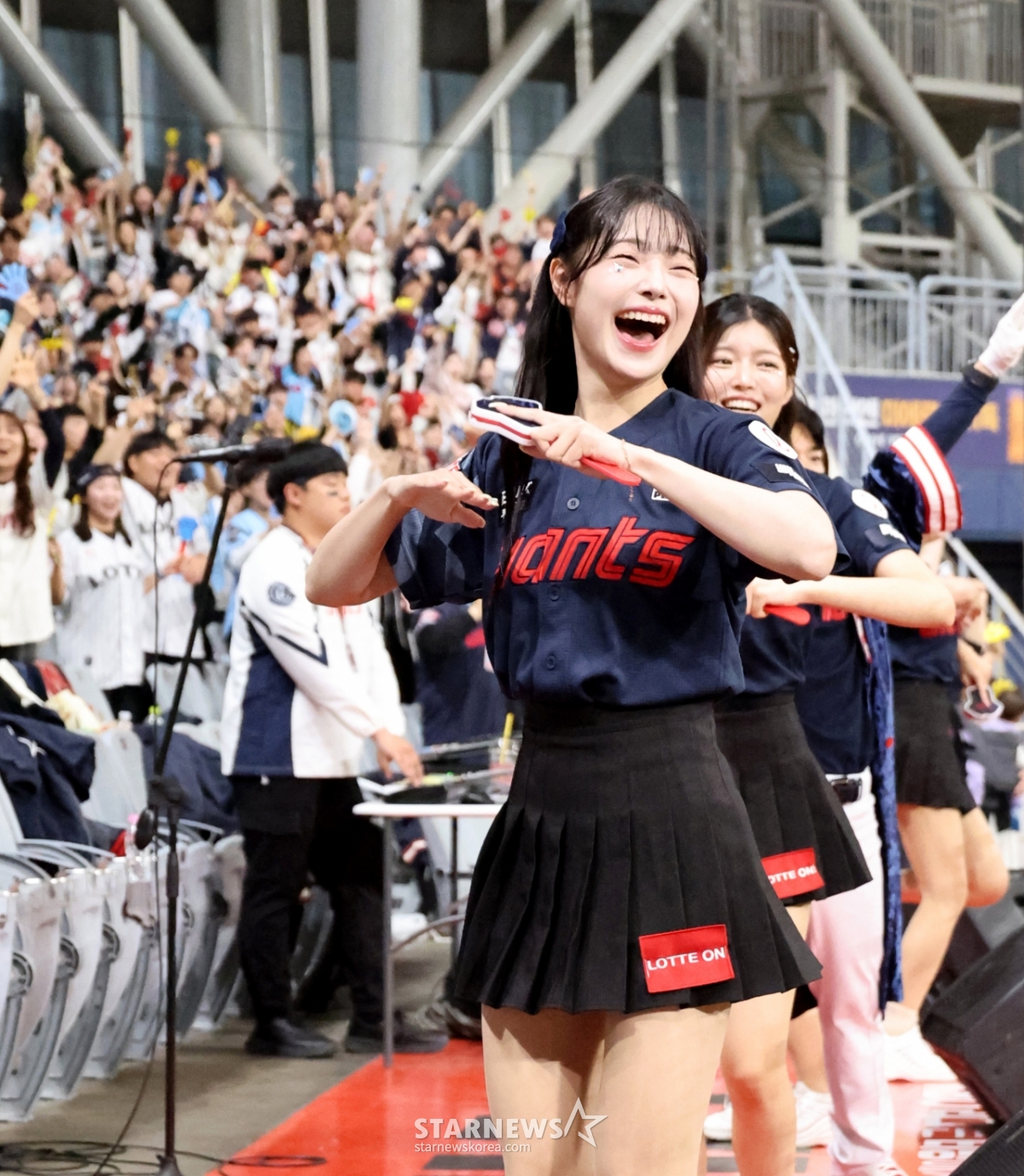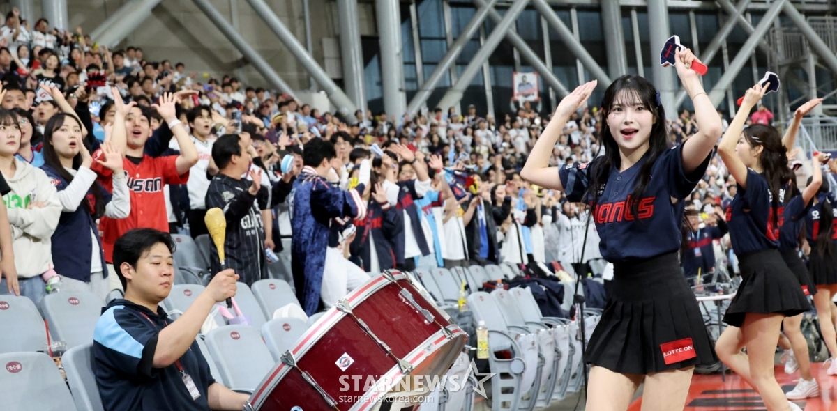Lotte cheerleader Lee Jo-eun is cheering after a hit opened in the top of the eighth inning of the 2026 KBO League game between the Lotte Giants and the Kiwoom Heroes at Gocheok Sky Dome on the 12th.. 2026.04.12.