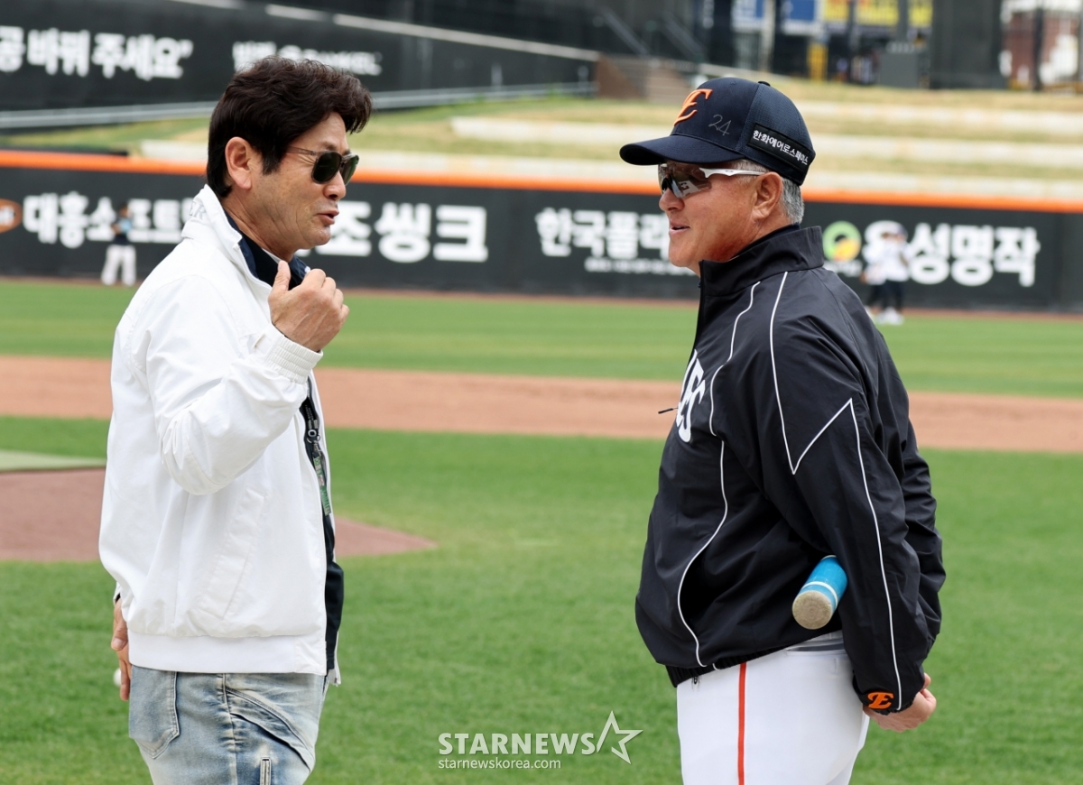 Commentator Kim Yong-guk talks with head coach Kim Kyung-moon ahead of the 2026 KBO League Hanwha Eagles and Samsung Lions match at Hanwha Life Ball Park in Daejeon on the 14th. 2026.04.14.