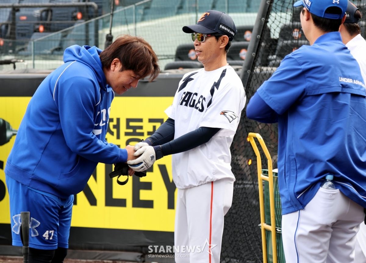 Samsung catcher Kang Min-ho talks with coach Kim Jae-gul ahead of the 2026 KBO League Hanwha Eagles and Samsung Lions game at Hanwha Life Ball Park in Daejeon on the 14th. 2026.04.14.