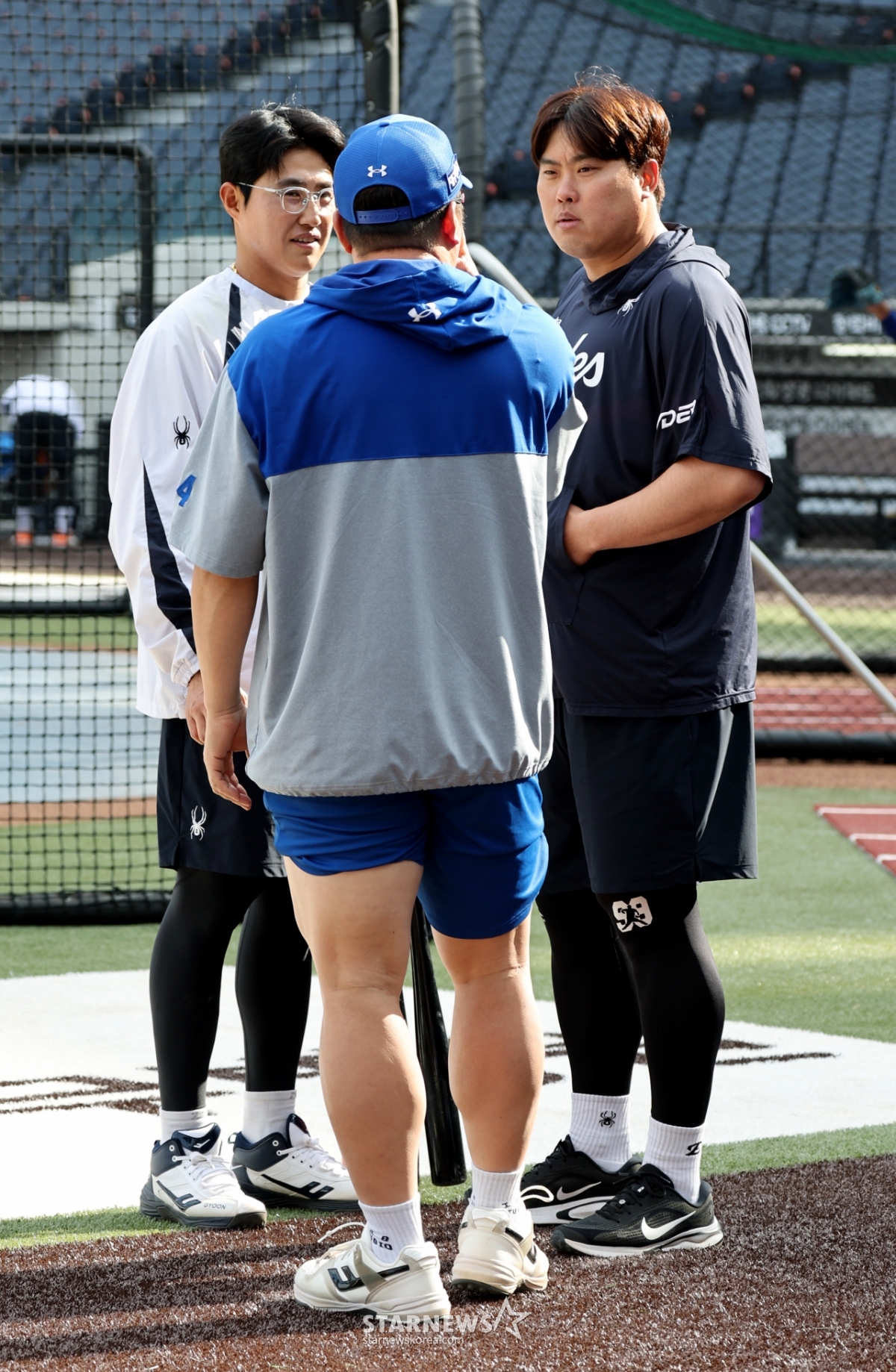 Hanwha Ryu Hyun-jin talks with Choi Hyung-woo, who was training before the 2026 KBO League Hanwha Eagles and Samsung Lions game at Hanwha Life Ball Park in Daejeon on the 14th. 2026.04.14.