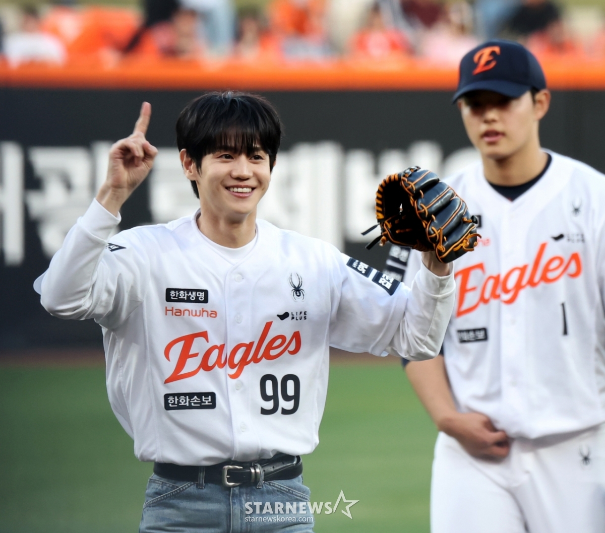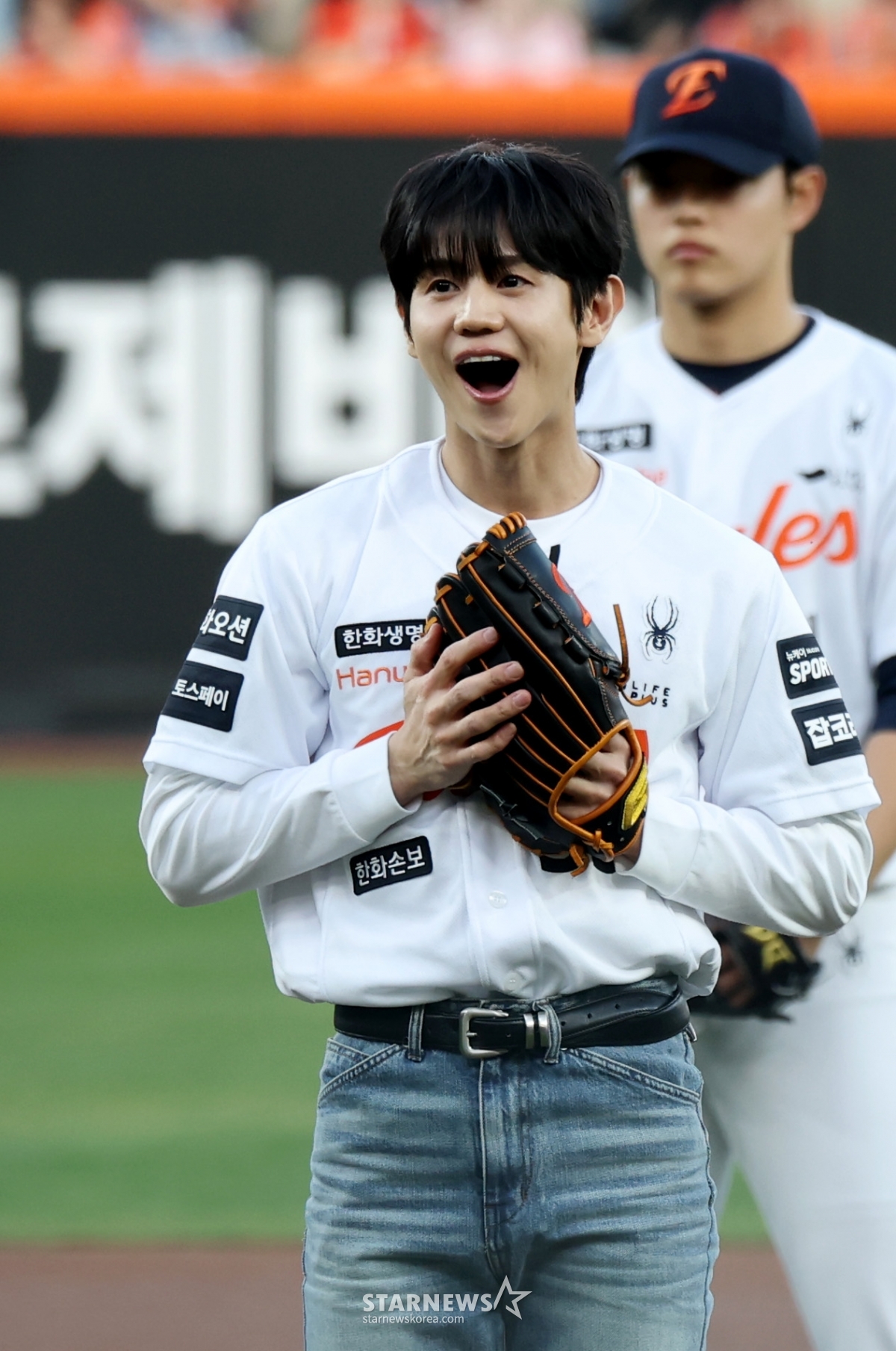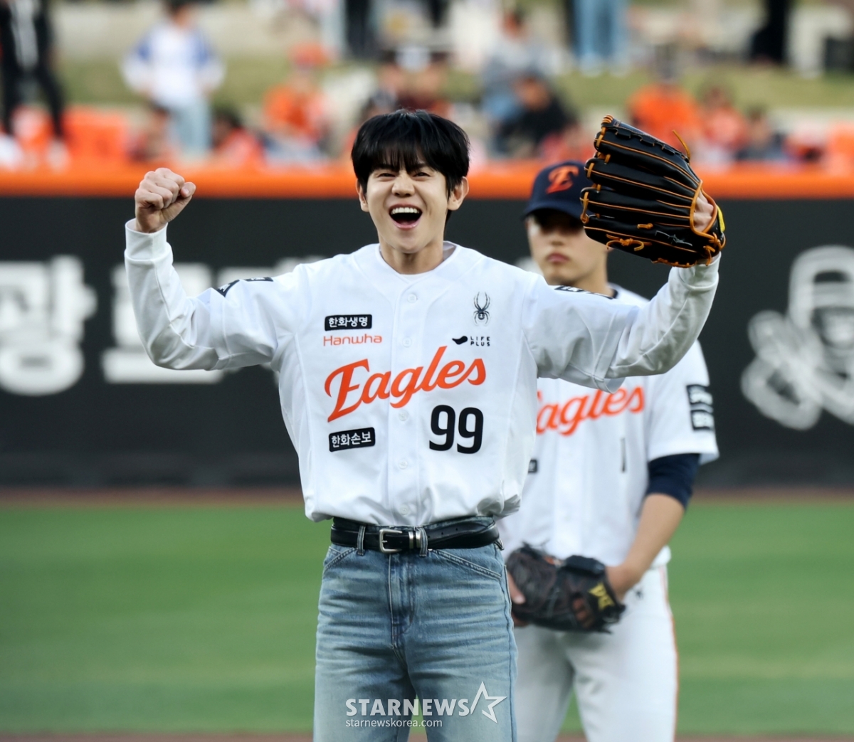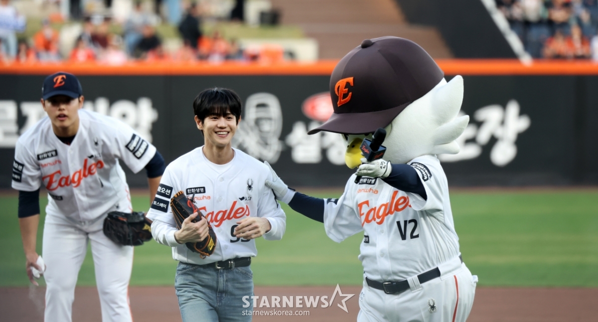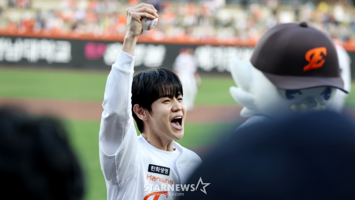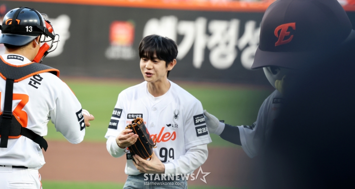 Highlight Yang Yo-seop roars with satisfaction after throwing the first pitch in the 2026 KBO League Hanwha Eagles and Samsung Lions game at Hanwha Life Ball Park in Daejeon on the 14th. 2026.04.14.