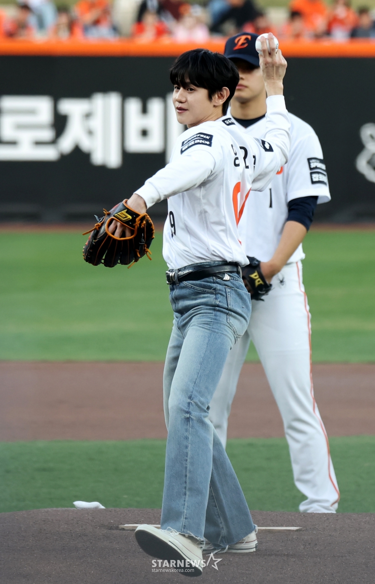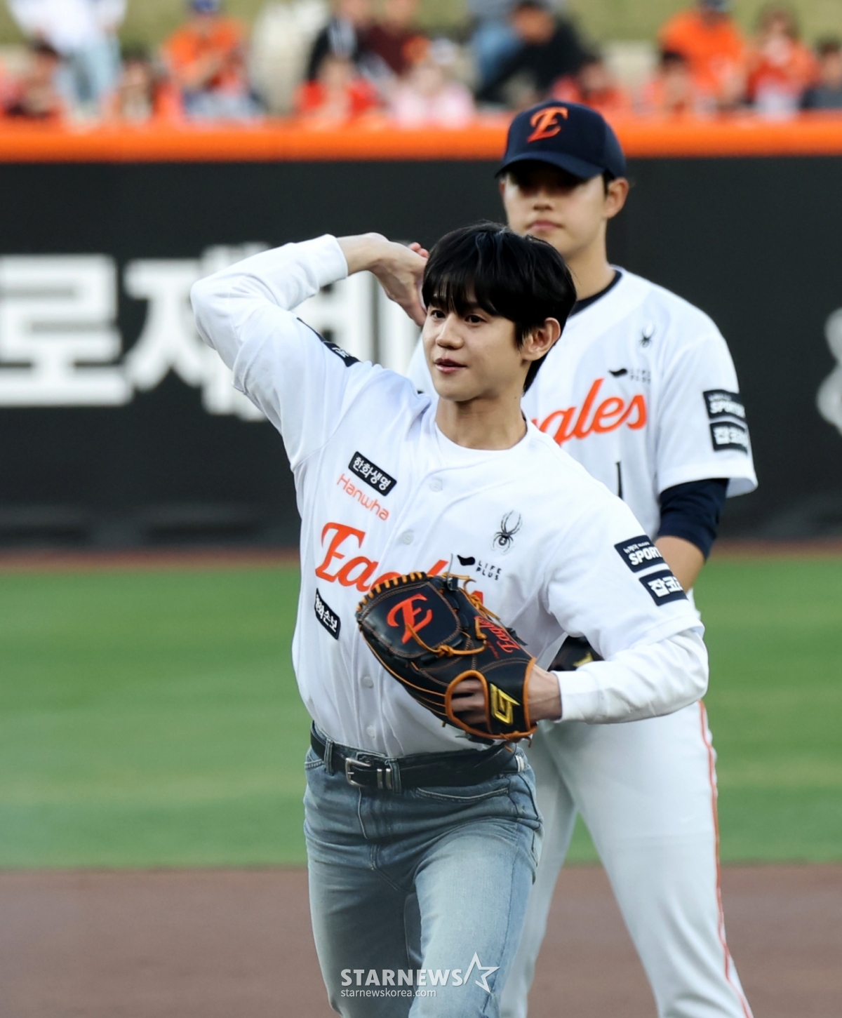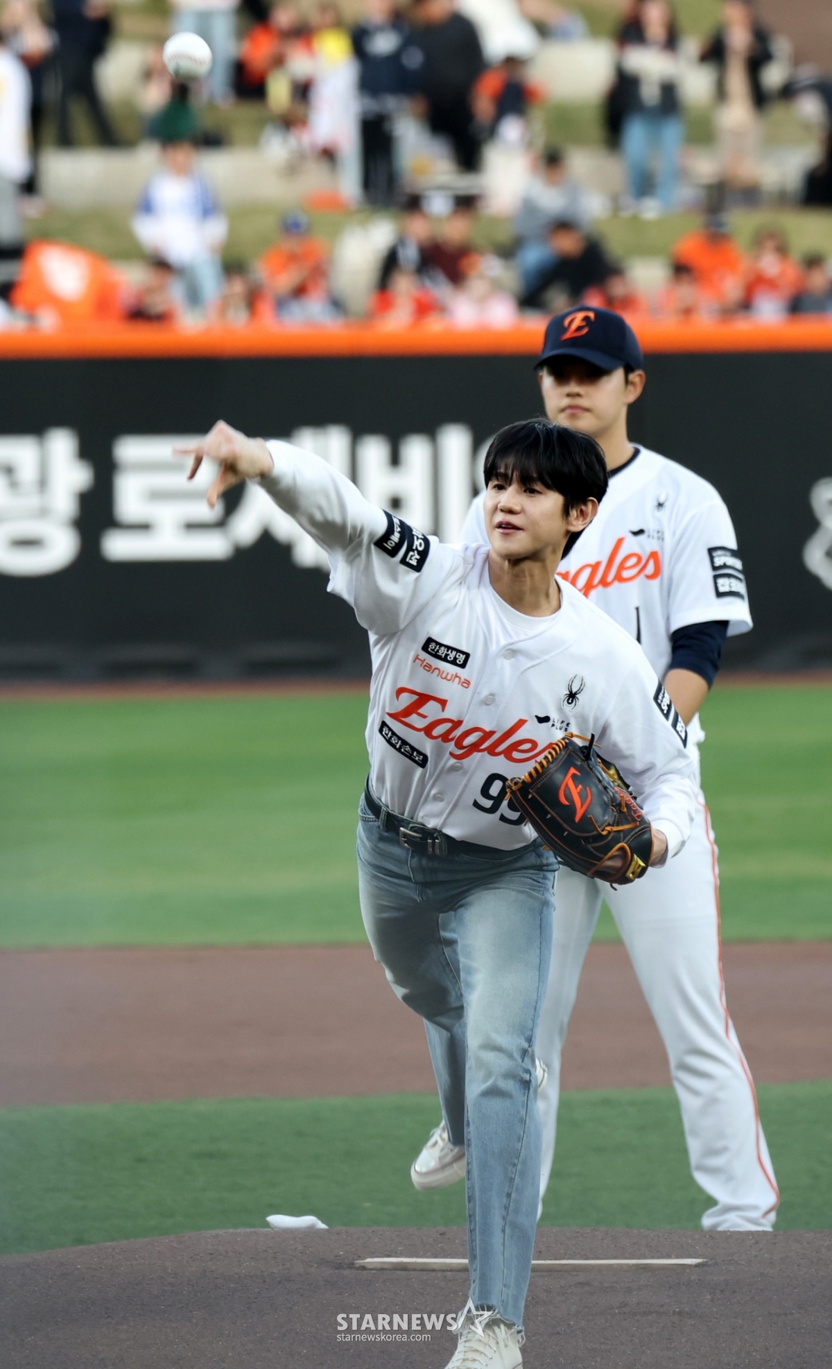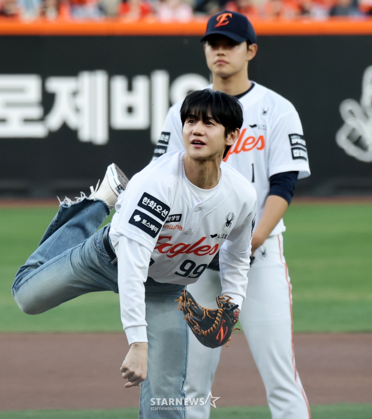 Highlight Yang Yo-seop roars with satisfaction after throwing the first pitch in the 2026 KBO League Hanwha Eagles and Samsung Lions game at Hanwha Life Ball Park in Daejeon on the 14th. 2026.04.14.