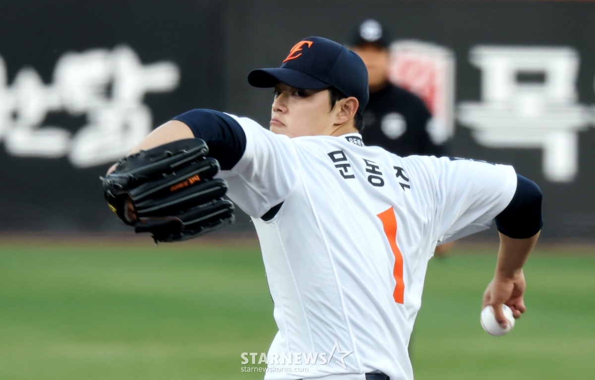 Hanwha right-hander Moon Dong-joo is pitching hard as a starter in the 2026 KBO League Hanwha Eagles and Samsung Lions game at Hanwha Life Ball Park in Daejeon on the 14th. 2026.04.14.