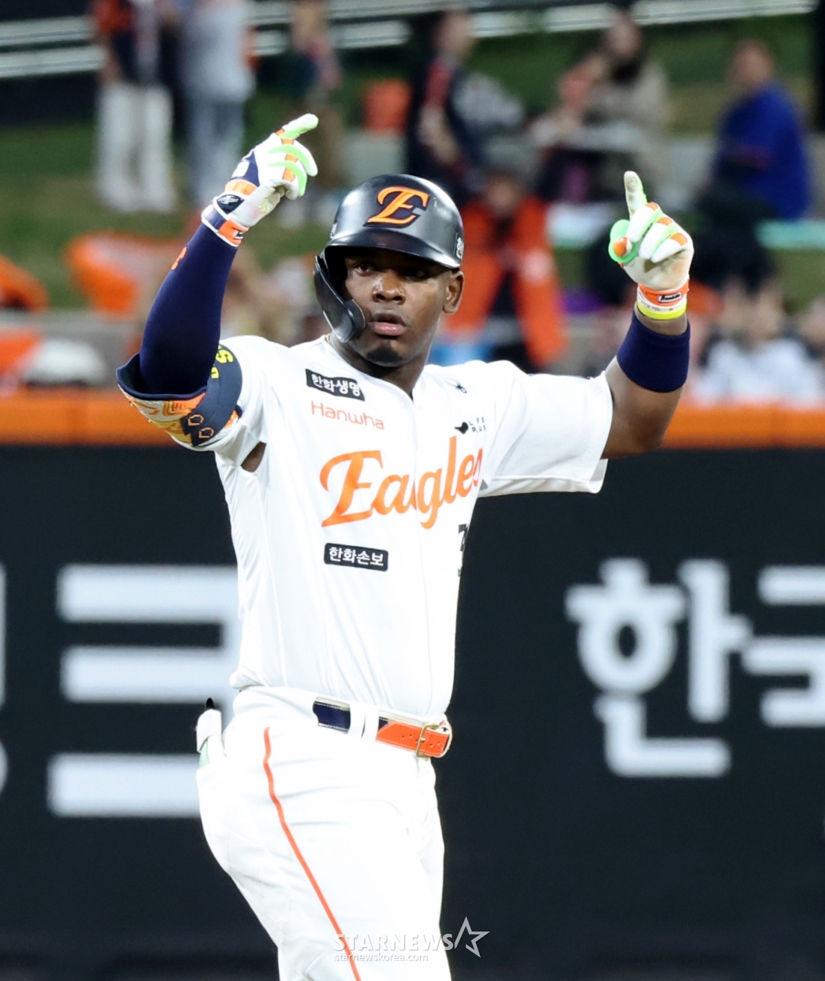 Hanwha's No. 2 hitter Peraza is creating a chance by getting on base with a double in the bottom of the third inning of the 2026 KBO League Hanwha Eagles and Samsung Lions game at Hanwha Life Ball Park in Daejeon on the 14th. 2026.04.14.
