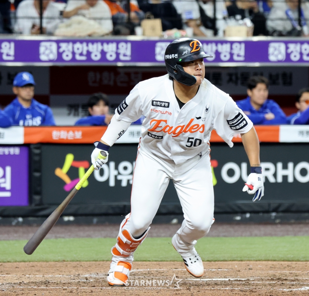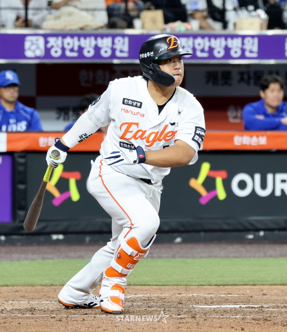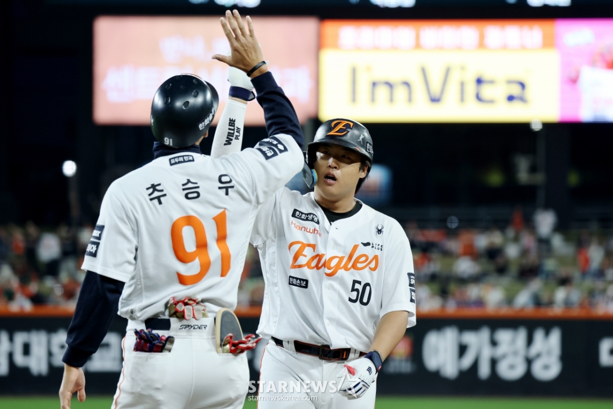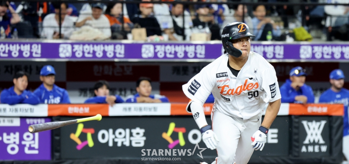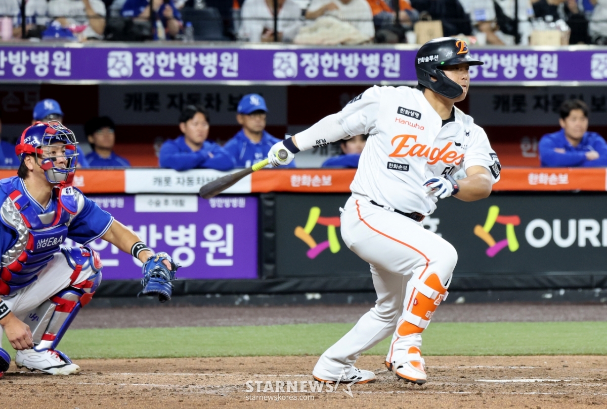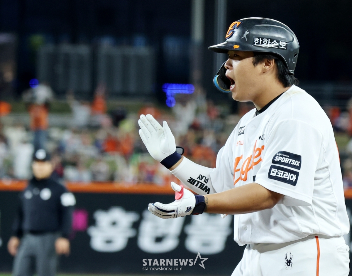 Hanwha's No. 4 hitter Kang Baek-ho celebrates after hitting a timely hit in the bottom of the third inning of the 2026 KBO League Hanwha Eagles and Samsung Lions game at Hanwha Life Ball Park in Daejeon on the 14th. 2026.04.14.