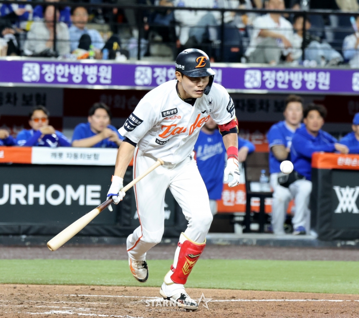 Hanwha's No. 9 hitter Shim Woo-joon is on base with a surprise bunt in the bottom of the fourth inning of the 2026 KBO League Hanwha Eagles and Samsung Lions game at Hanwha Life Ball Park in Daejeon on the 14th.