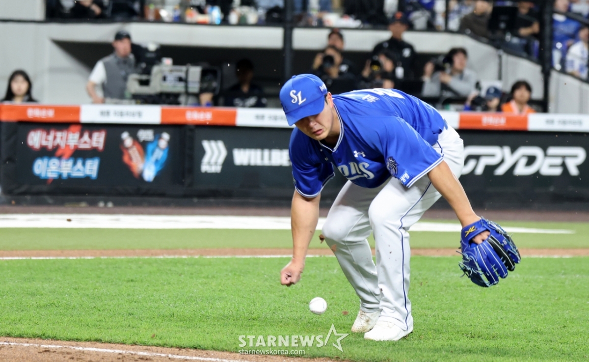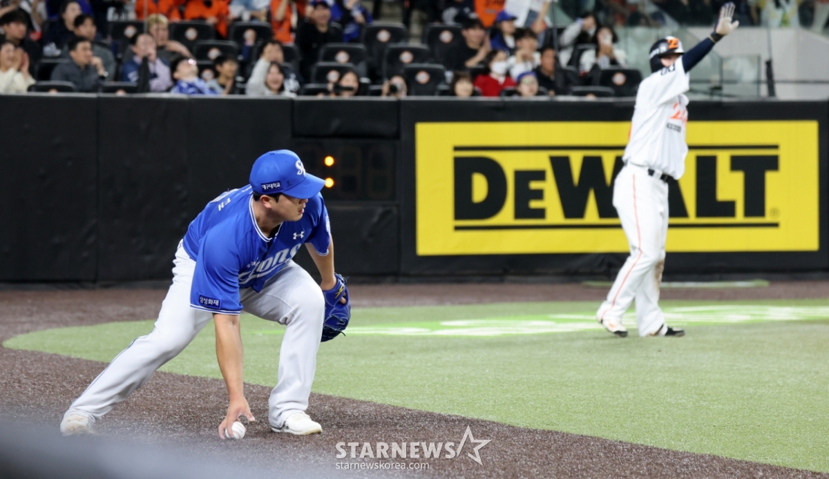 Choi Won-tae fumbled the ball, and the third baseman scored and Shim Woo-joon was safe at first base. 2026.04.14.