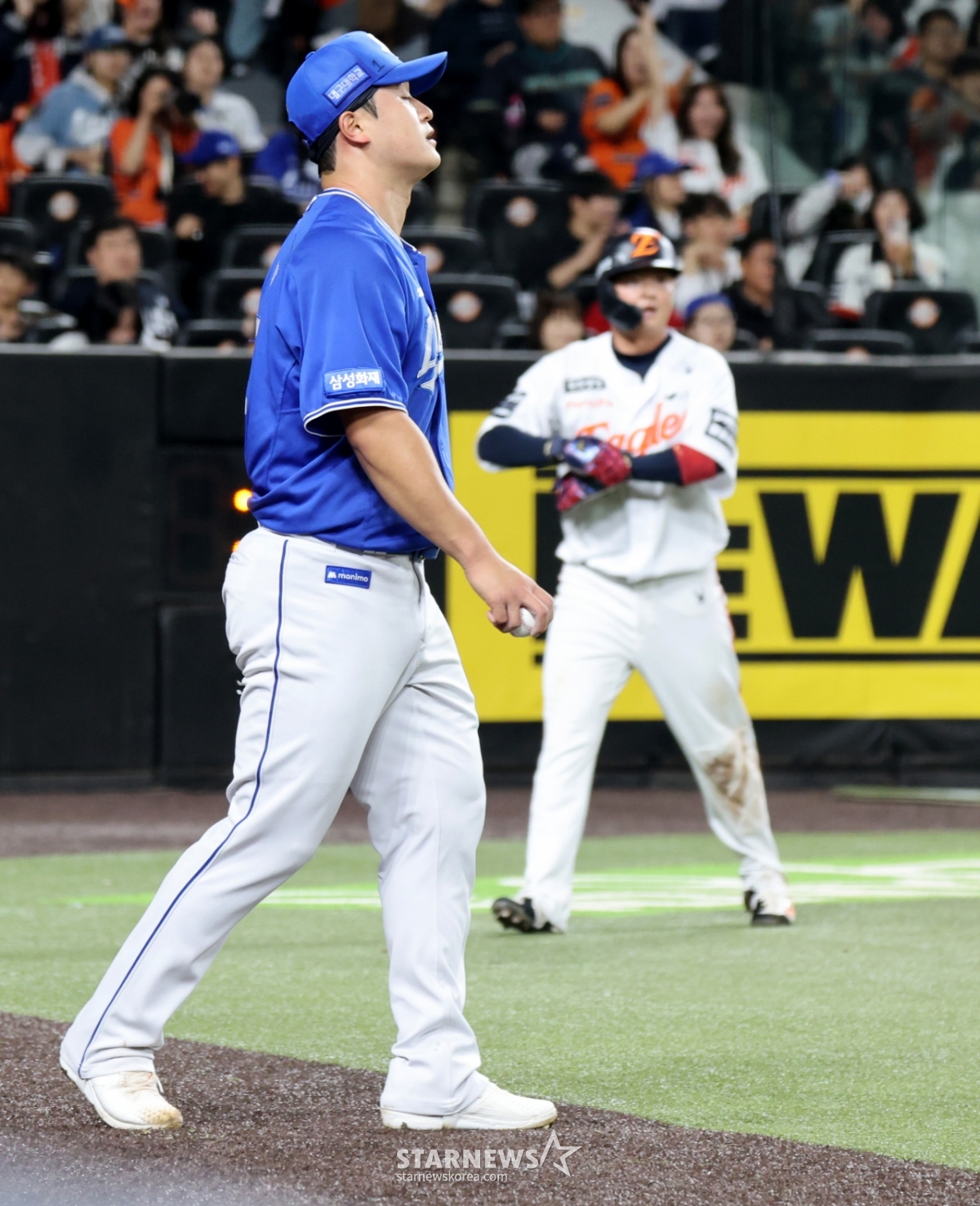 Choi Won-tae, who is in a hurry, fails to catch the ball properly and hits it out of the line.