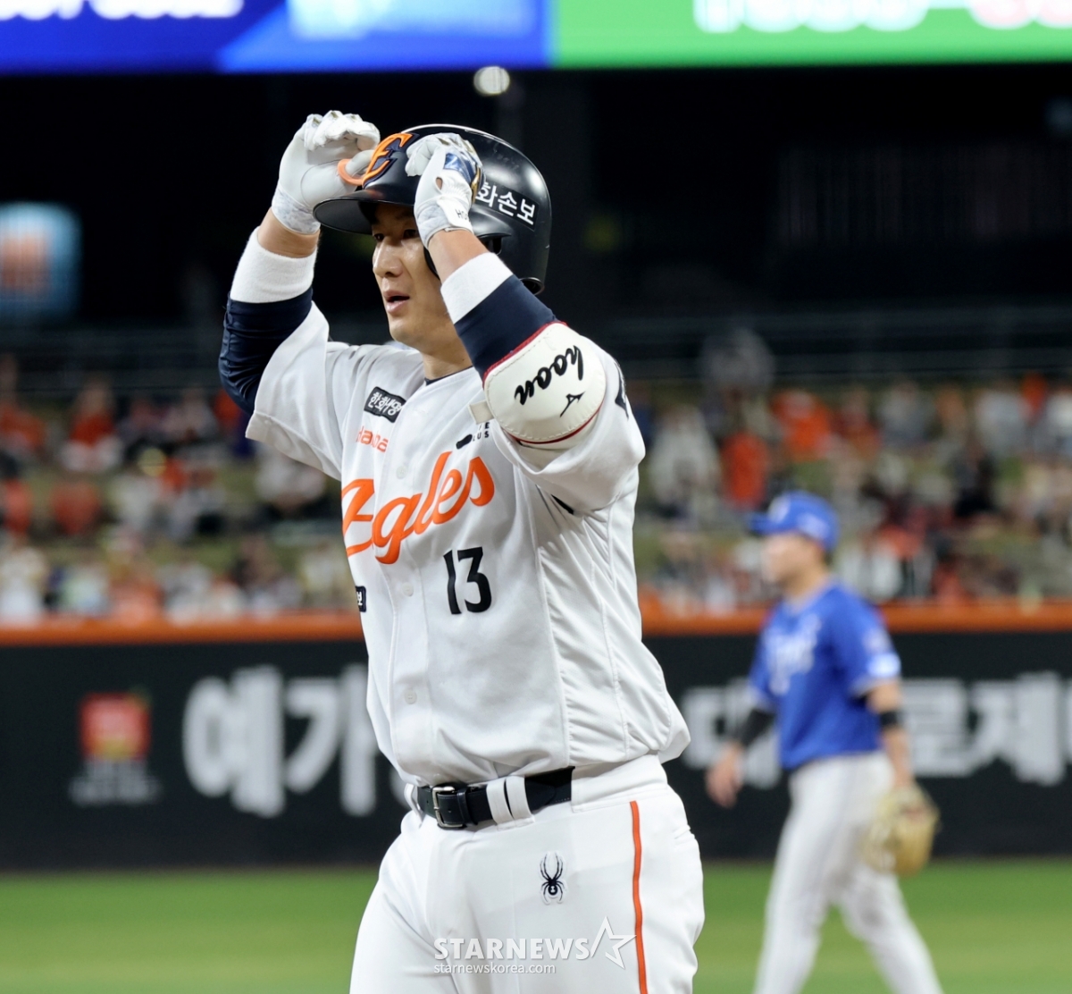 Hanwha's No. 8 hitter Choi Jae-hoon is on base with a hit in the bottom of the fourth inning of the 2026 KBO League Hanwha Eagles and Samsung Lions game at Hanwha Life Ball Park in Daejeon on the 14th. 2026.04.14.