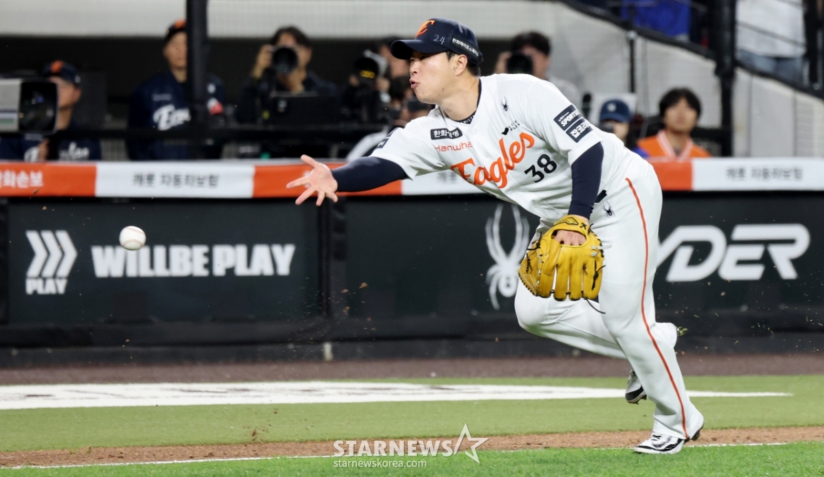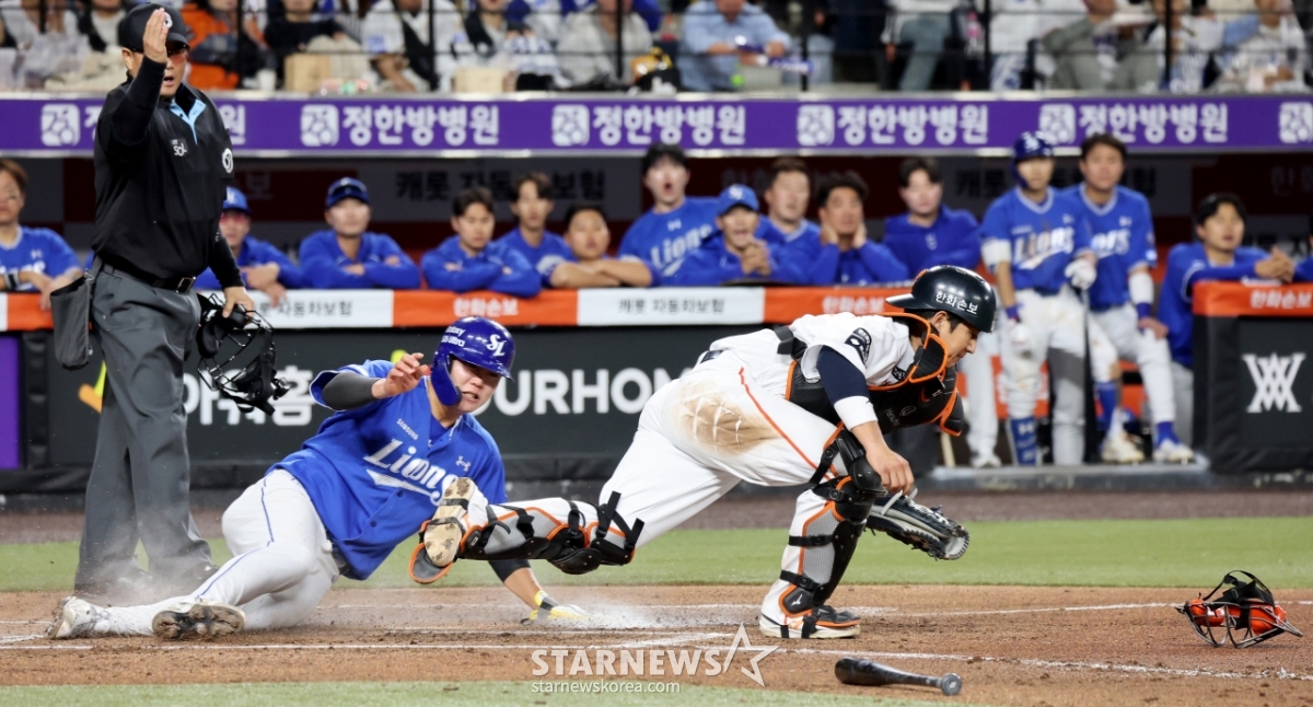 Hanwha catcher Choi Jae-hoon catches third baseman Ryu Ji-hyuk at home when Yang Woo-hyun, the ninth batter of Samsung, has an infield ground ball with one out in the top of the sixth inning of the 2026 KBO League Hanwha Eagles and Samsung Lions game at Hanwha Life Ball Park in Daejeon on the 14th. Pitcher Kim Jong-soo, who caught the ball, is tossing home. . 2026.04.14.