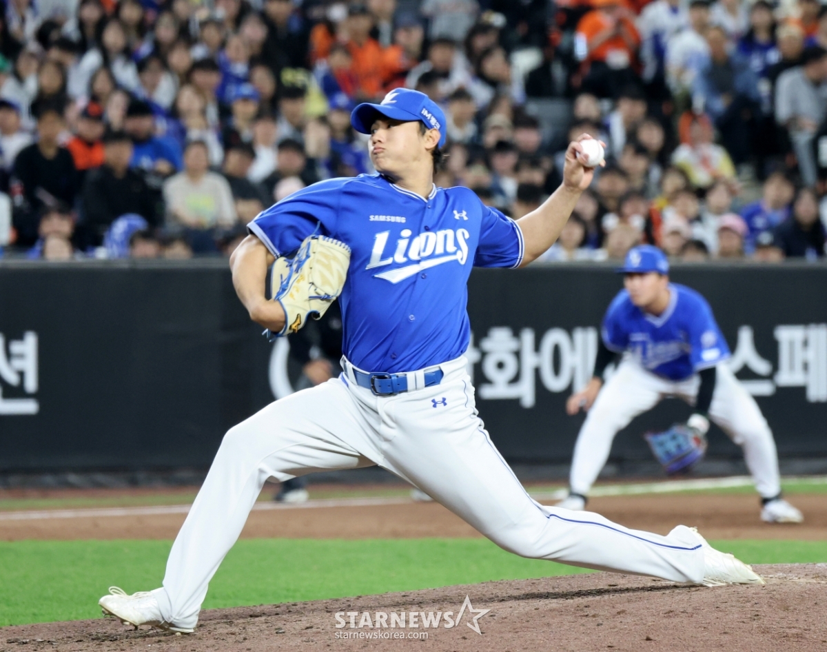 Samsung left-handed bullpen Bae Chan-seung takes the mound in the bottom of the sixth inning of the 2026 KBO League Hanwha Eagles and Samsung Lions game at Hanwha Life Ball Park in Daejeon on the 14th. . 2026.04.14.