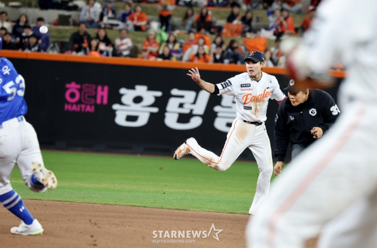 Hanwha shortstop Shim Woo-joon is tossing Samsung's Park Seung-gyu ball with two outs in the top of the sixth inning of the 2026 KBO League Hanwha Eagles and Samsung Lions game at Hanwha Life Ball Park in Daejeon on the 14th. . 2026.04.14.