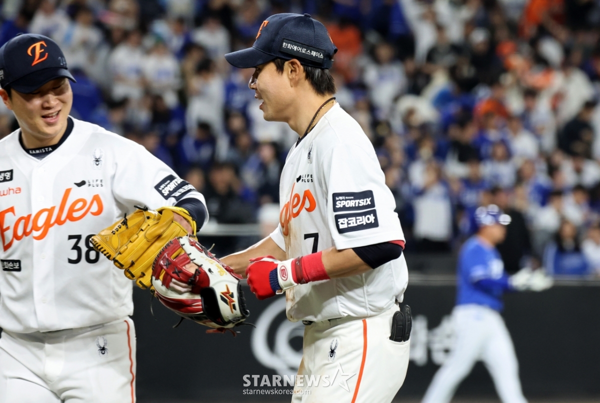 Hanwha right-handed bullpen Kim Jong-soo smiles as Shim Woo-joon ends the inning by catching Samsung's Park Seung-kyu's ball hard and tossing it to second base with the bases loaded with two outs in the top of the sixth inning of the 2026 KBO League Hanwha Eagles and Samsung Lions game at Hanwha Life Ball Park in Daejeon on the 14th. . 2026.04.14.