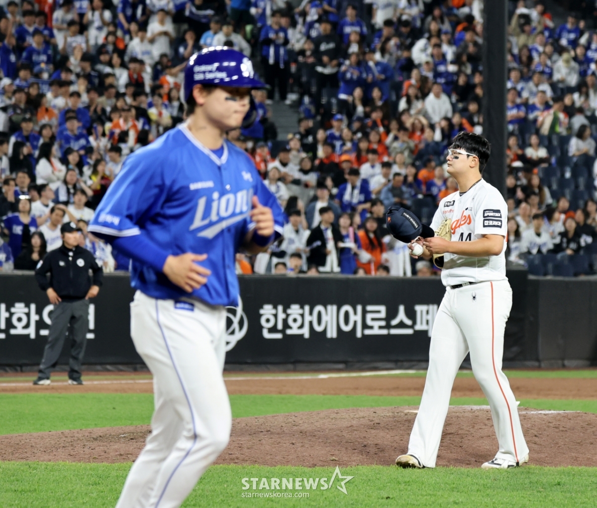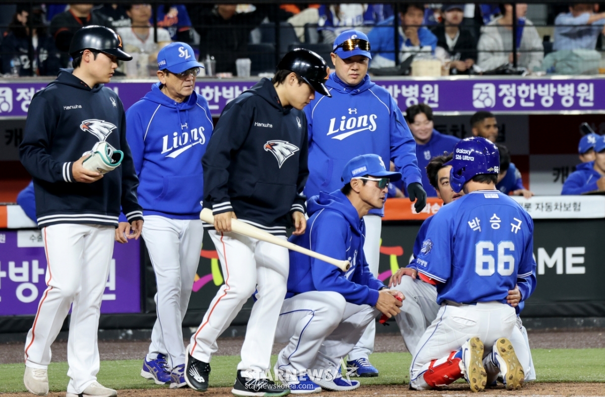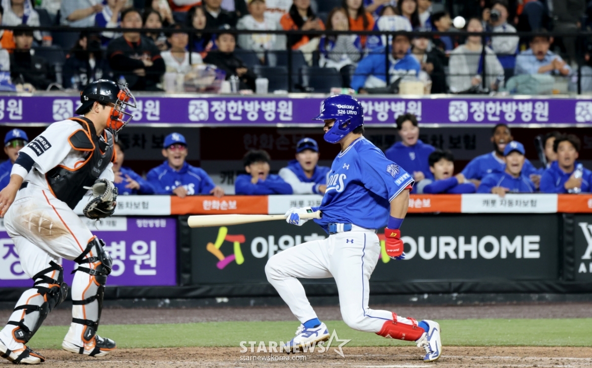 Samsung's No. 1 hitter Park Seung-kyu is hit by Kim Seo-hyun's ball in the top of the ninth inning of the 2026 KBO League Hanwha Eagles and Samsung Lions game at Hanwha Life Ball Park in Daejeon on the 14th. 2026.04.14.