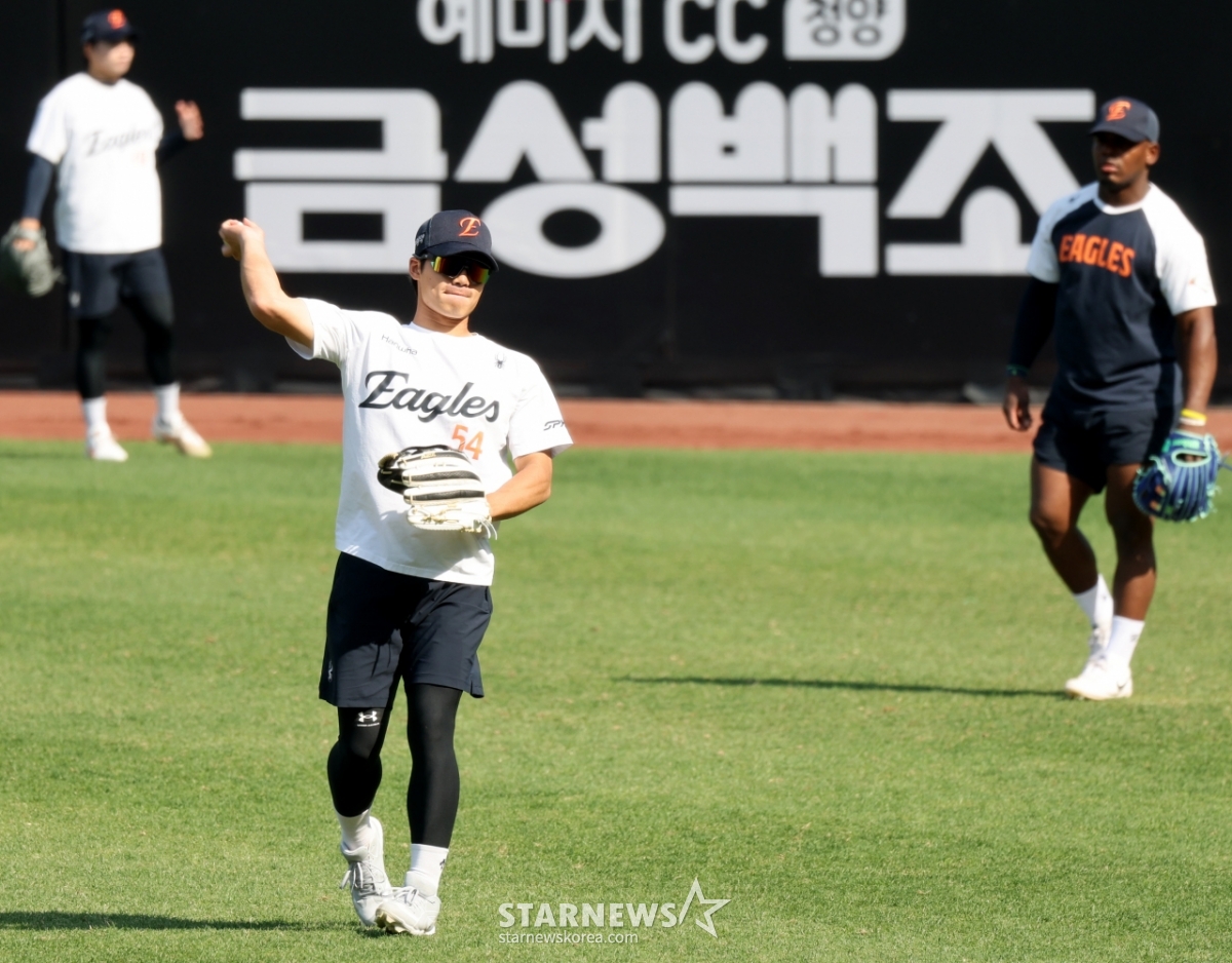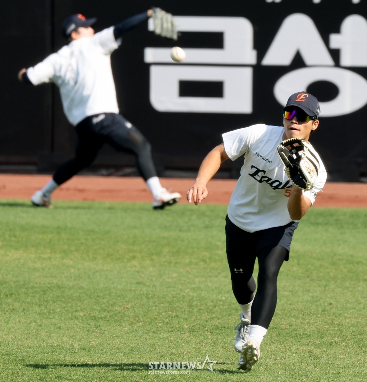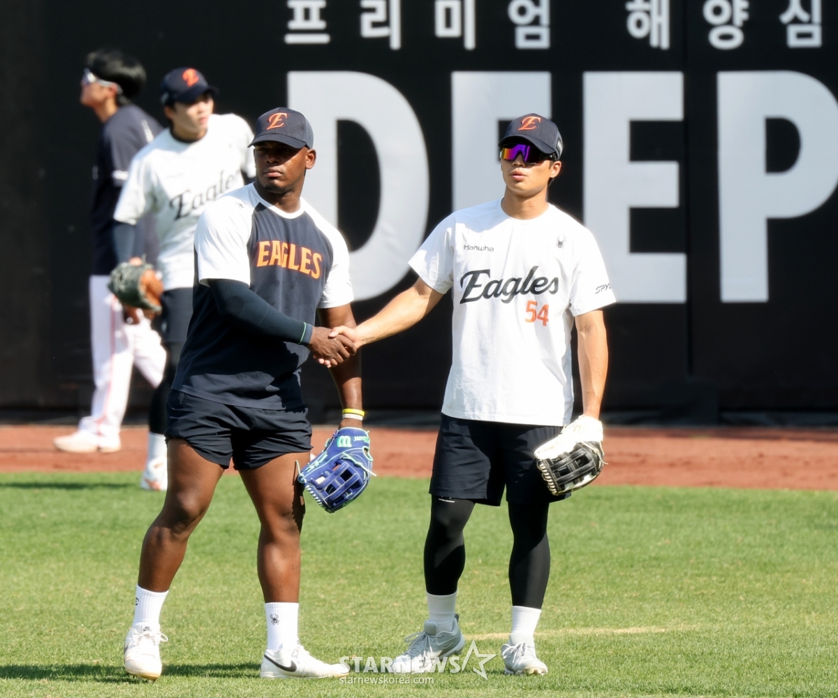 Hanwha outfielder Oh Jae-won is training for outfielder with Peraza ahead of the 2026 KBO League Hanwha Eagles and Samsung Lions game at Hanwha Life Ball Park in Daejeon on the 15th.