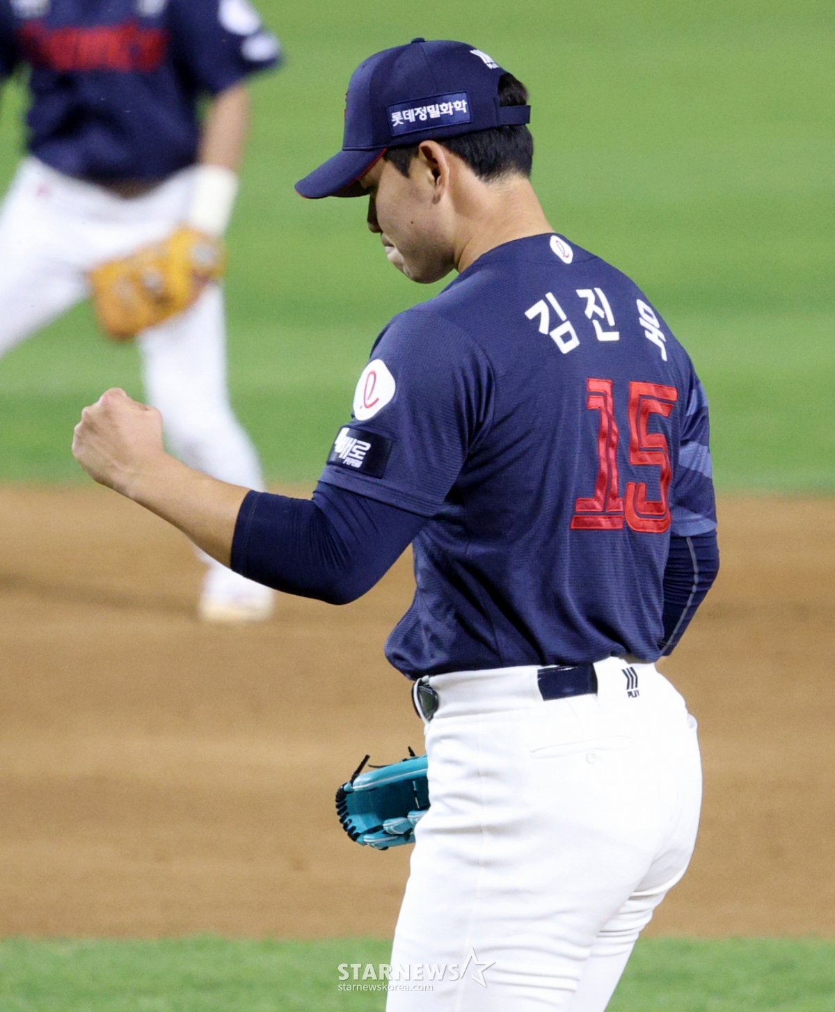 Lotte starter Kim Jin-wook is cheering after striking out LG Shin Min-jae in the bottom of the fifth inning with two outs and runners on the first and second bases.