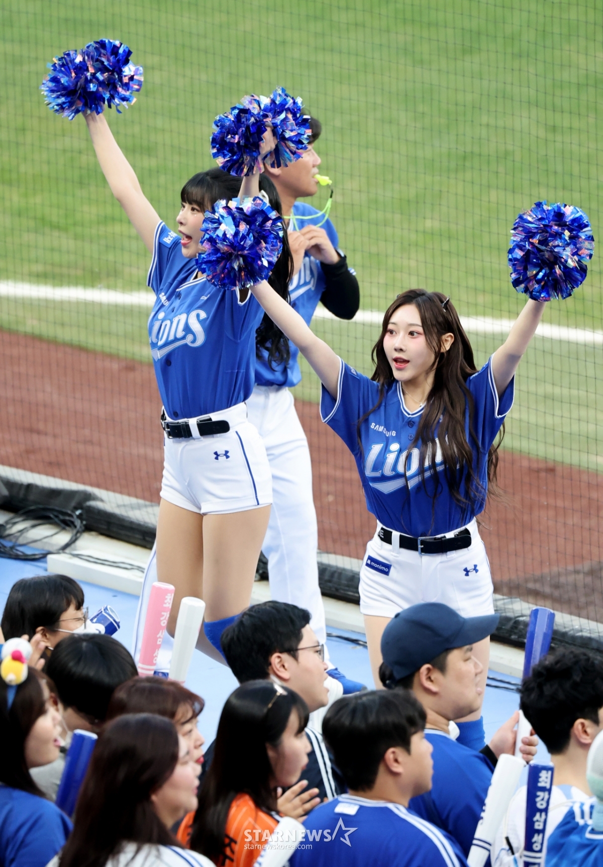 Samsung cheerleaders Chun So-yoon and Han Ji-eun are cheering enthusiastically in the 2026 KBO League Hanwha Eagles and Samsung Lions match at Hanwha Life Ball Park in Daejeon on the 15th. 2026.04.15.