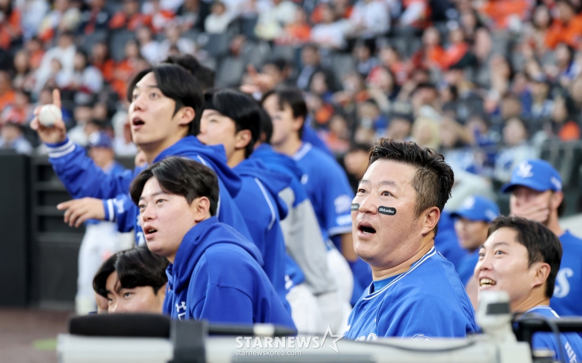 Samsung's No. 7 hitter Jeon Byung-woo hit a good hit with the bases loaded with one out in the top of the first inning of the 2026 KBO League Hanwha Eagles and Samsung Lions game at Hanwha Life Ball Park in Daejeon on the 15th, but when it became a double, he asked to check his home run. Choi Hyung-woo and Samsung players checking the electronic display. 2026.04.15.