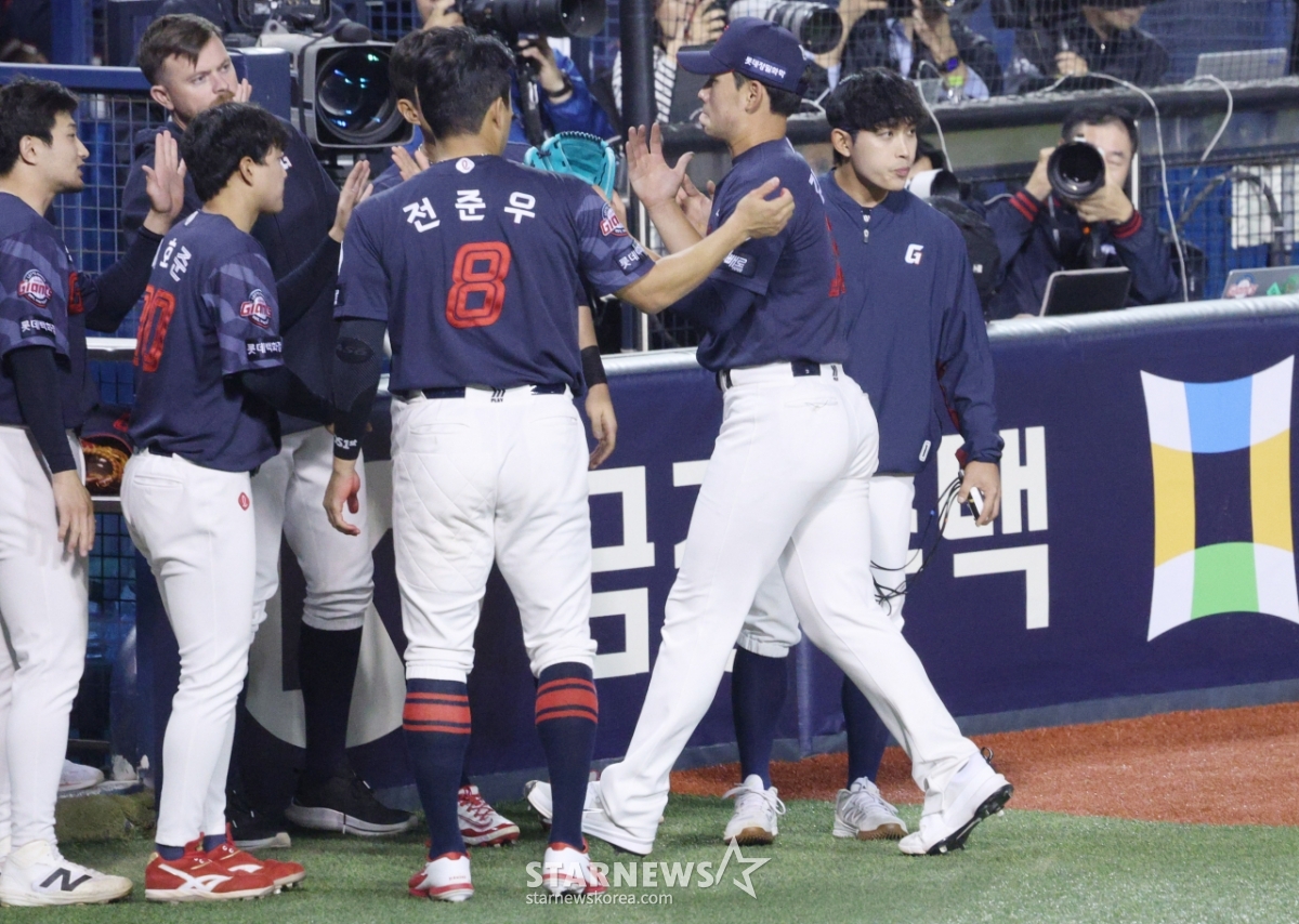 Lotte starter Kim Jin-wook is welcomed by his teammates after being replaced in the bottom of the seventh inning.