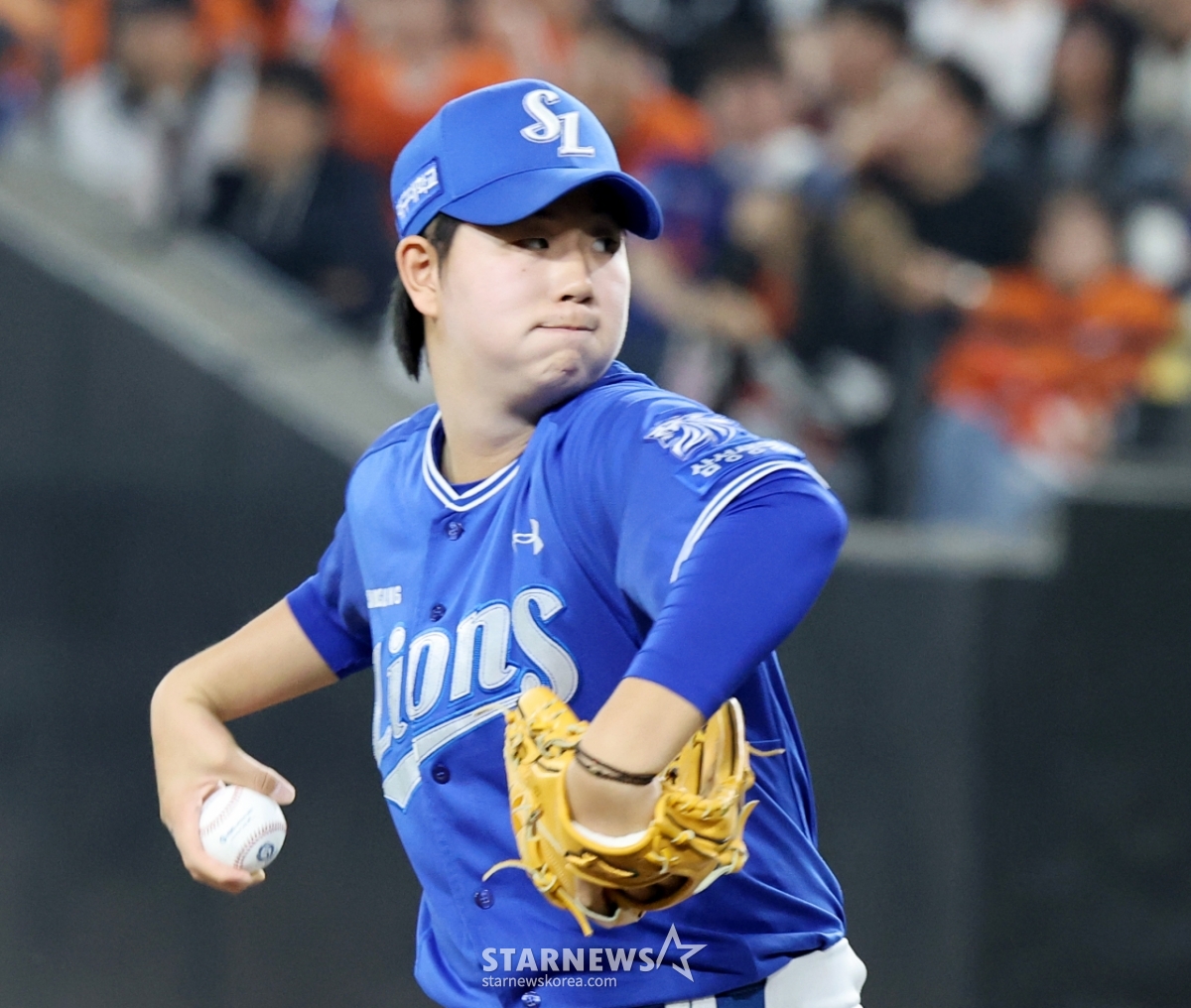 Samsung right-hander Jung Chan-hee is pitching hard in the 2026 KBO League Hanwha Eagles and Samsung Lions game at Hanwha Life Ball Park in Daejeon on the 15th. 2026.04.15.