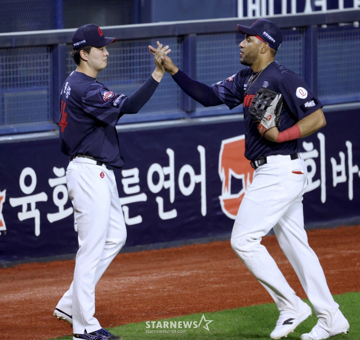 Lotte's Kim Won-joong is making a high five with Reyes after completing his relief effort in the eighth inning.