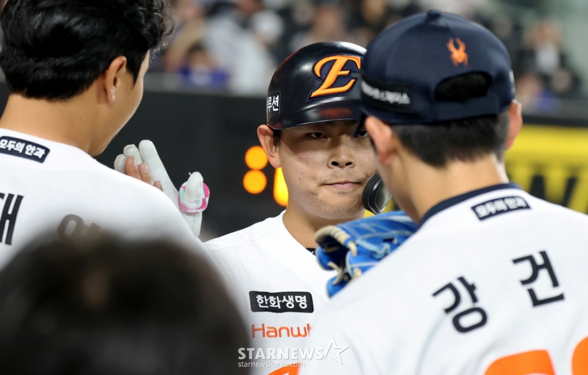 Hanwha's No. 8 hitter Heo In-seo is home-in after hitting a two-run home run against Baek Jung-hyun in the bottom of the sixth inning of the 2026 KBO League Hanwha Eagles and Samsung Lions game at Hanwha Life Ball Park in Daejeon on the 15th. 2026.04.15.