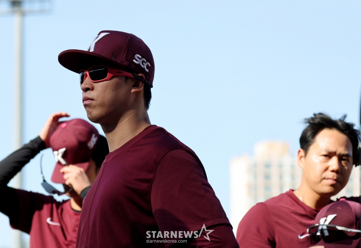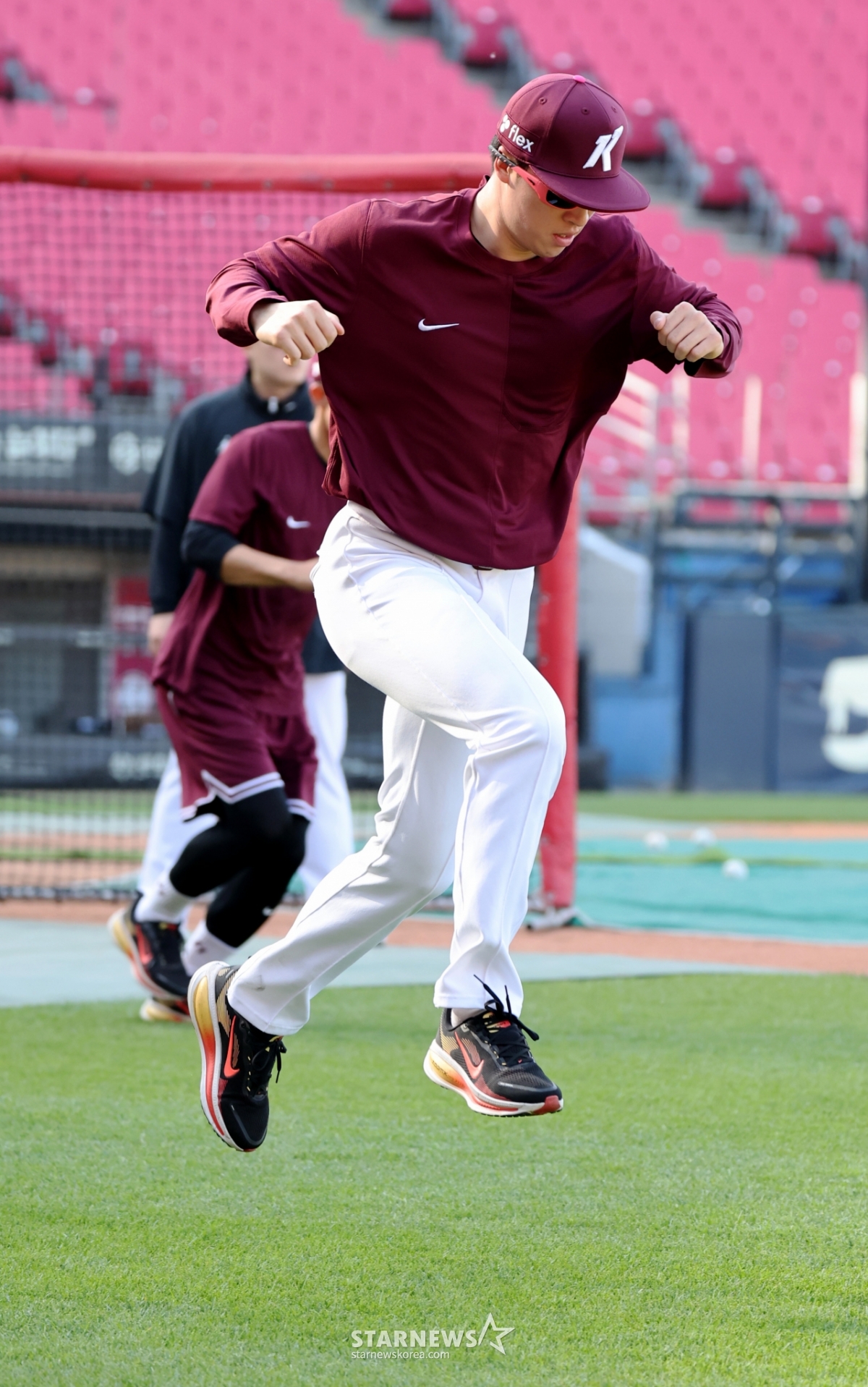 Kiwoom Heroes starting pitcher Bae Dong-hyun stretches ahead of the 2026 KBO League match between Kia Tigers and Kiwoom Heroes, scheduled to be held at GwangjuKIA Champions Field on the 16th. 2026.04.16.