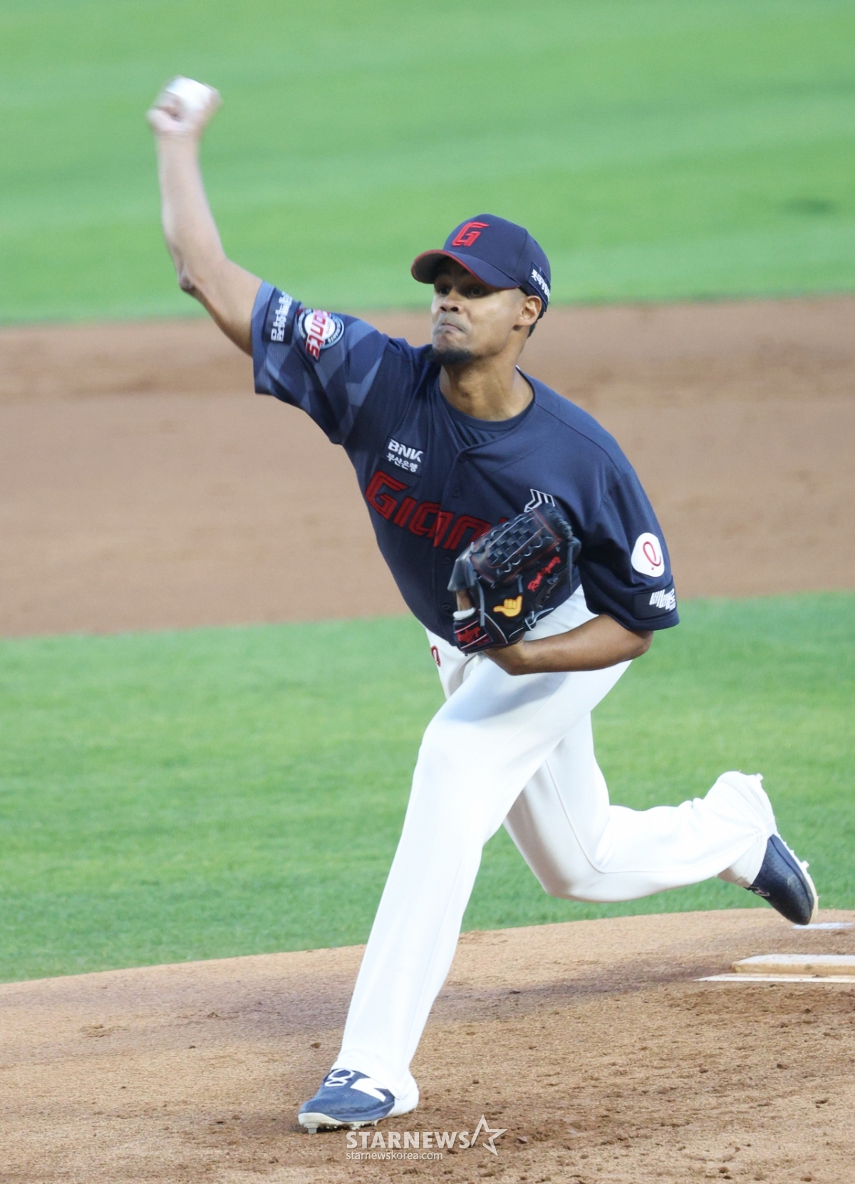Lotte's starter Rodriguez is pitching hard.