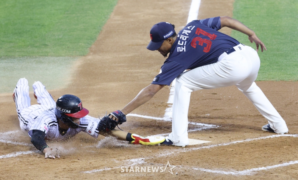 In the bottom of the second inning with one out and a runner on second base, Lotte starter Chirinos threw a wild pitch, allowing runner Cheon Sung-ho to attempt to score, but he was tagged out.