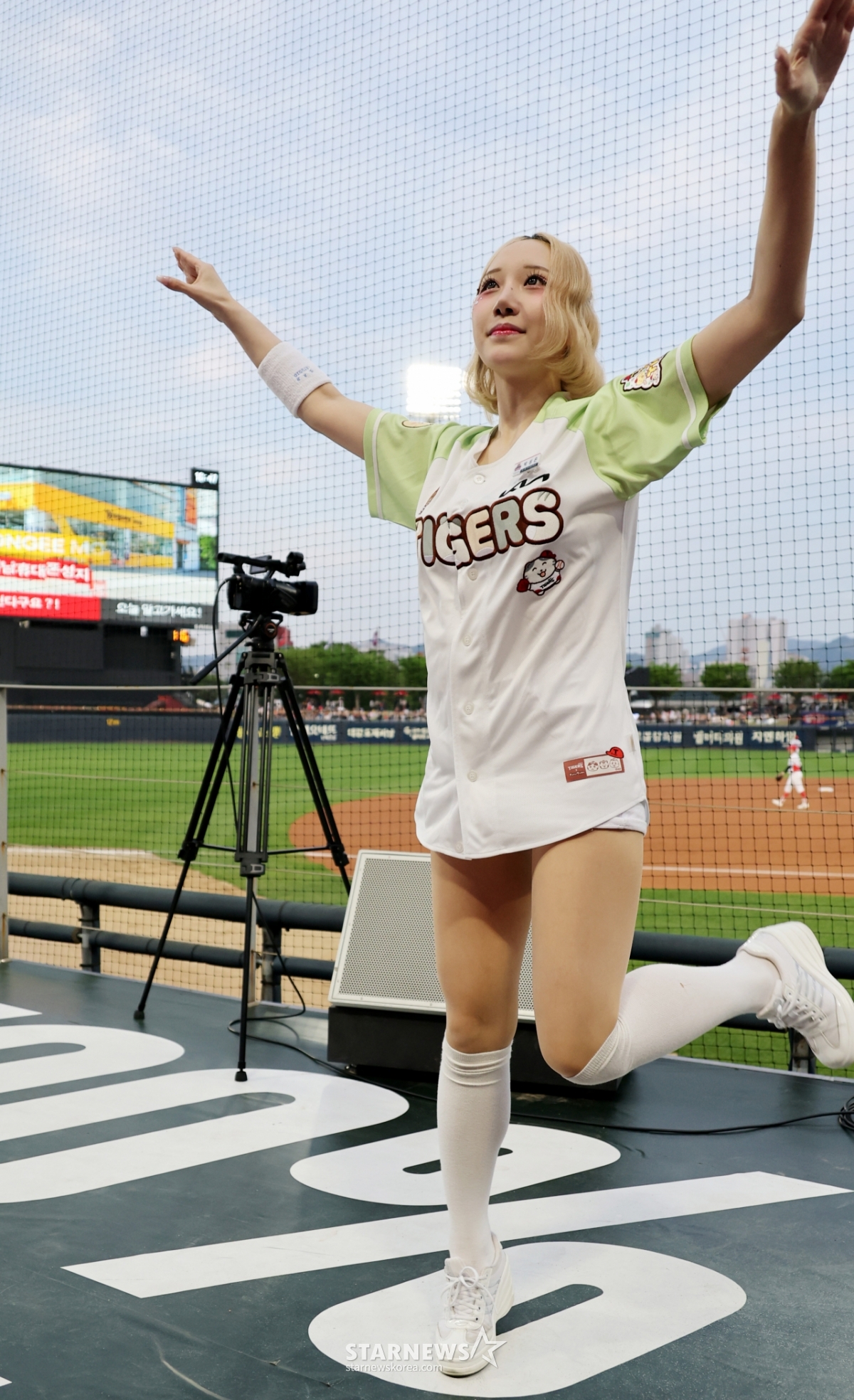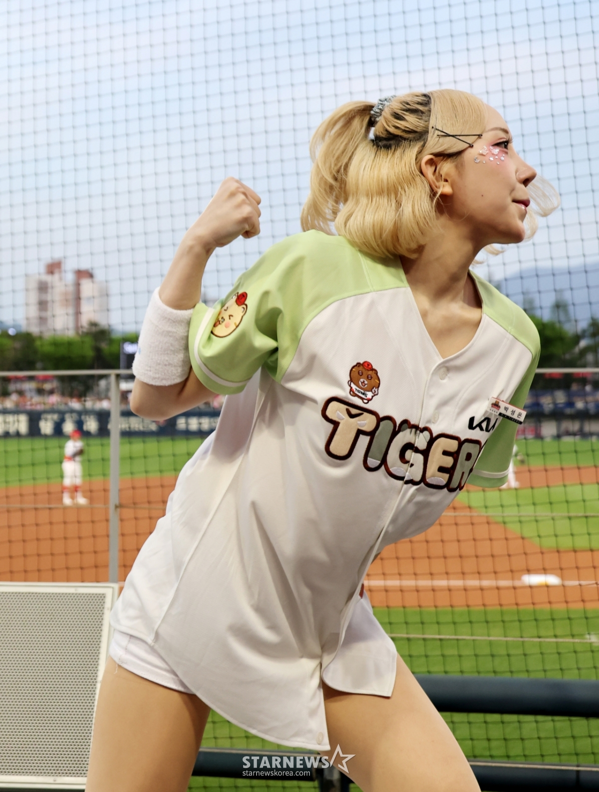 Kia cheerleader Park Seong-eun waved her blonde hair while cheering enthusiastically at the 2026 KBO League game between Kia Tigers and Kiwoom Heroes, held at GwangjuKIA Champions Field on the 16th. 2026.04.16.
