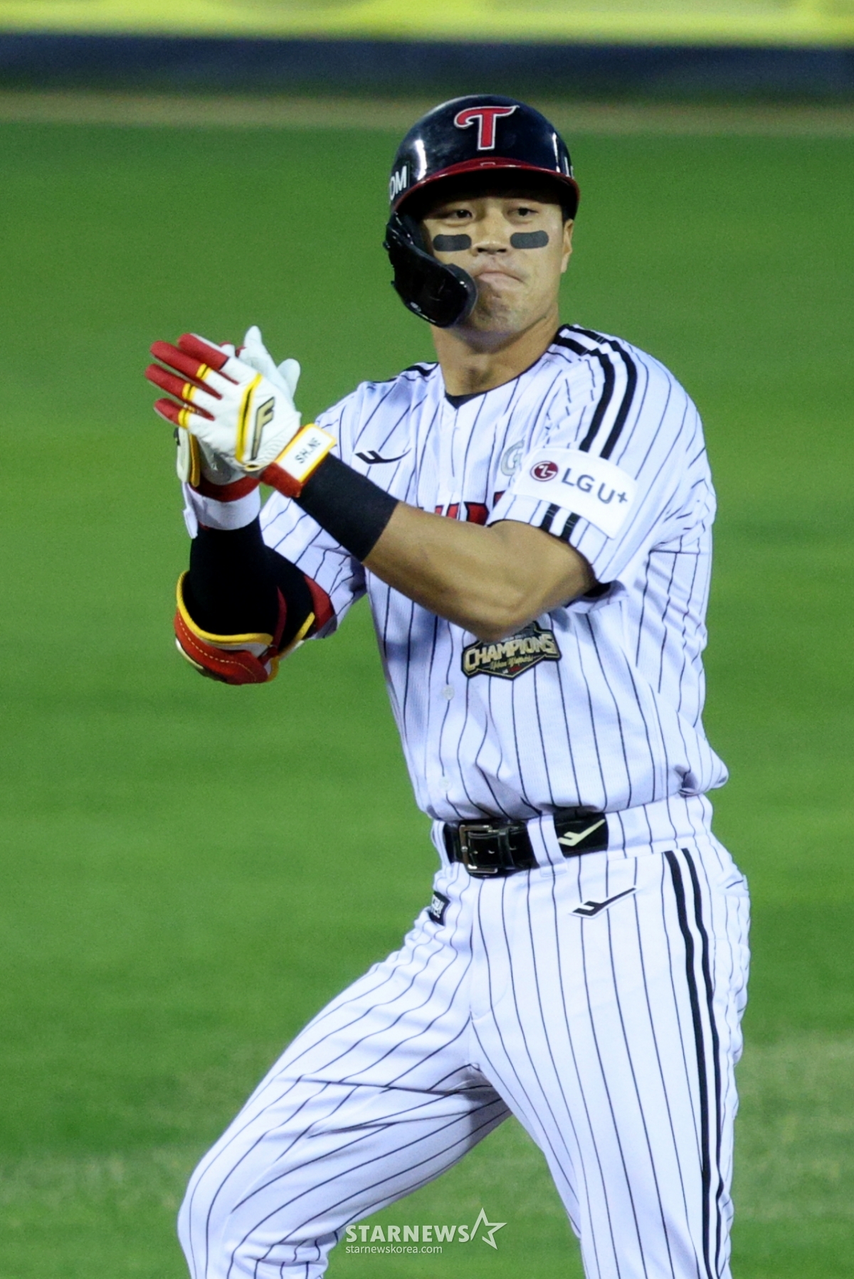 LG's Cheon Sung-ho hit a two-run double to tie the game with one out in the bottom of the second inning, reached base, and then performed a celebration.