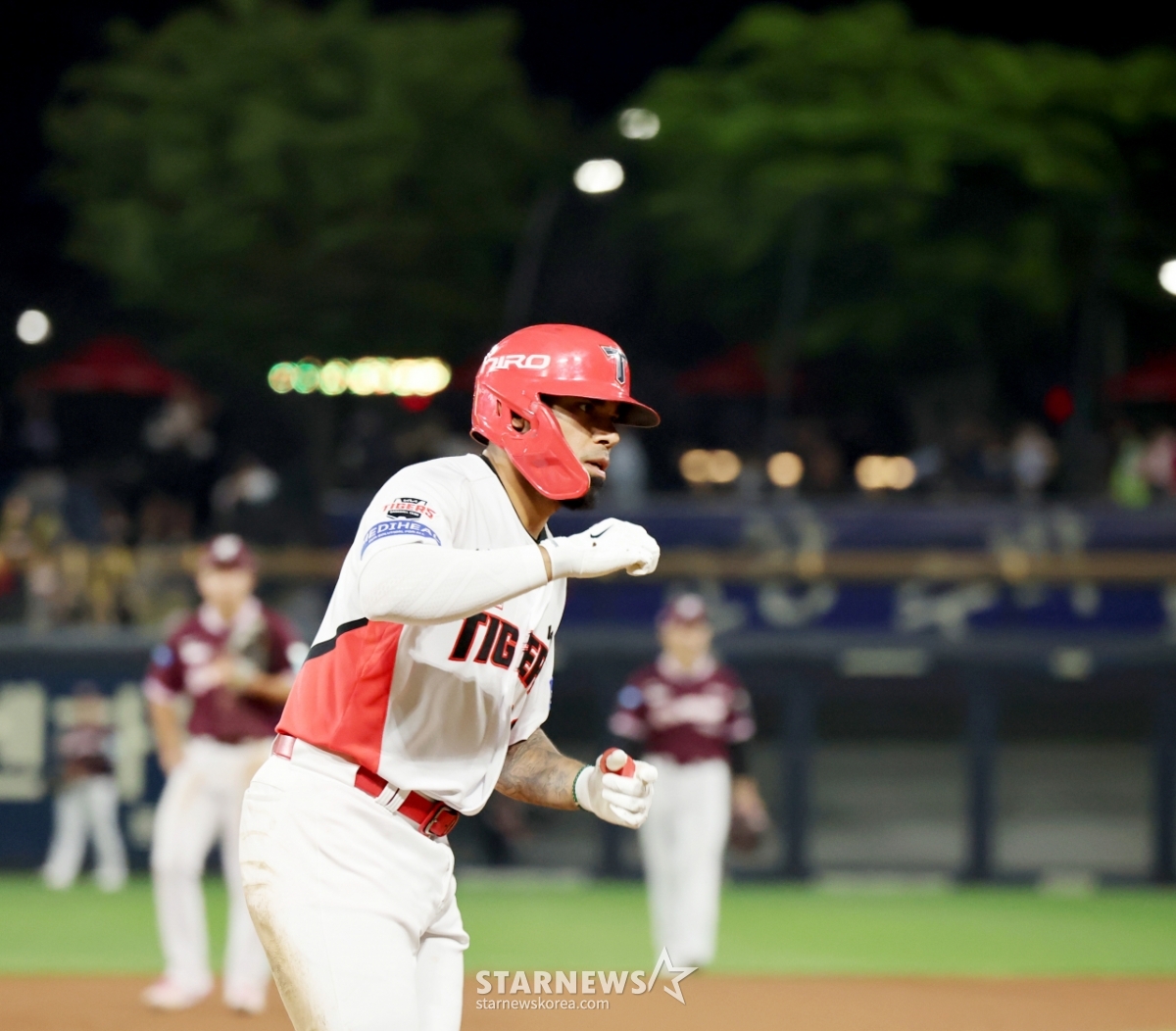 Kia's sixth-order hitter Castro is shown crossing home plate after hitting a go-ahead two-run home run off Alcántara in the bottom of the sixth inning with two outs and a runner on first base at the Kia Tigers vs. Kiwoom Heroes game held at GwangjuKIA Champions Field on the 16th. 2026.04.16.
