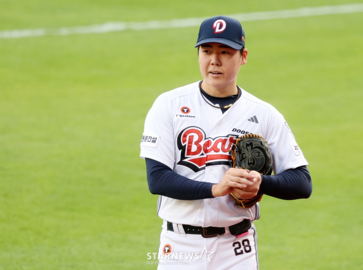 Doosan starter Choi Seung-yong is heading to the dugout after completing four innings of pitching.