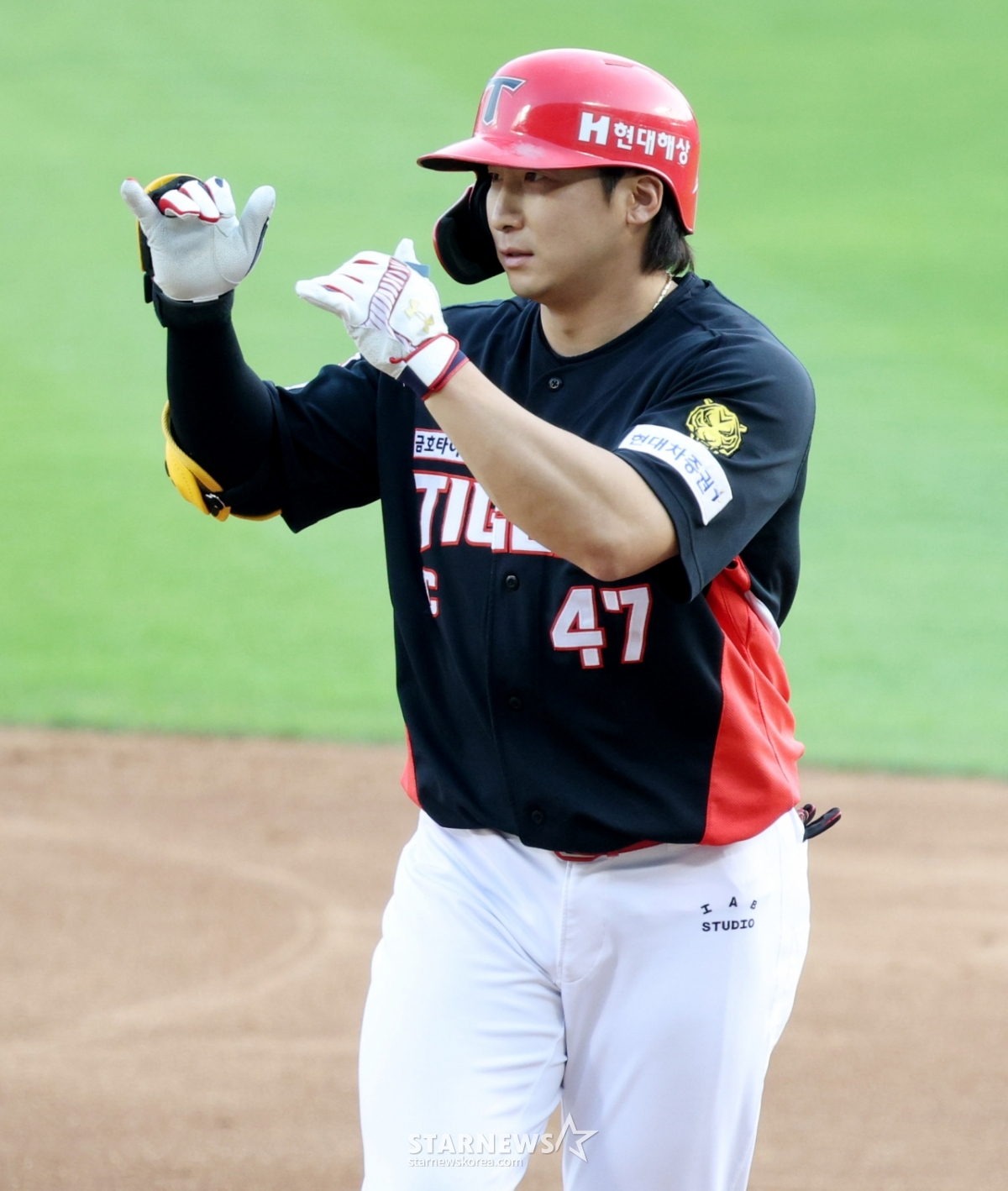 KIA's Na Sung-beom is performing a ceremony after reaching base with a single to left field with no outs in the bottom of the fifth inning.