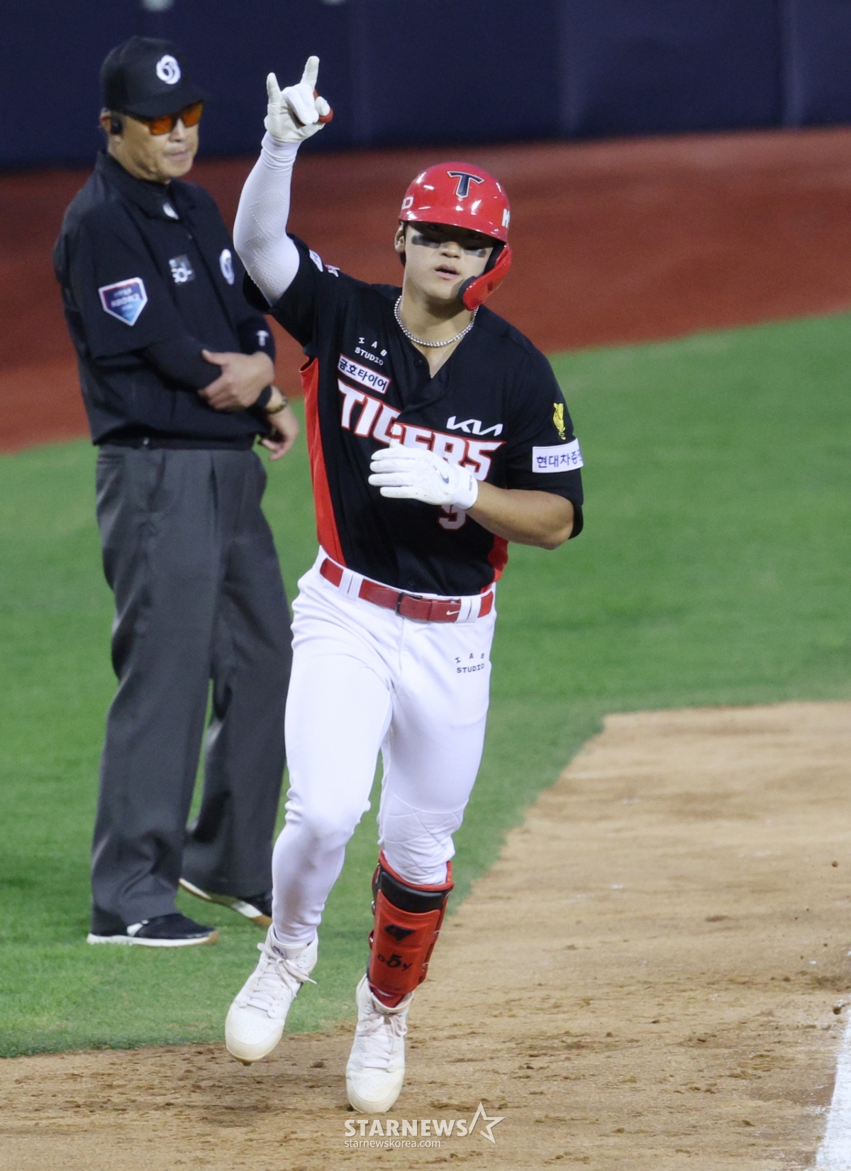 KIA's Kim Do-young hit a go-ahead two-run home run against Doosan's Kim Taek-yeon in the bottom of the 8th inning with one out and a runner on second base, then crossed home plate.