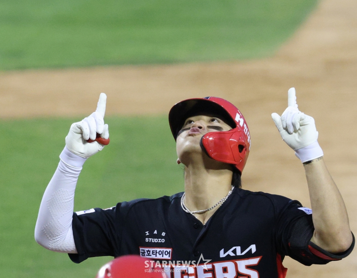 KIA's Kim Do-young hit a go-ahead two-run home run against Doosan's Kim Taek-yeon in the bottom of the eighth inning with one out and a runner on second base, then crossed home plate.