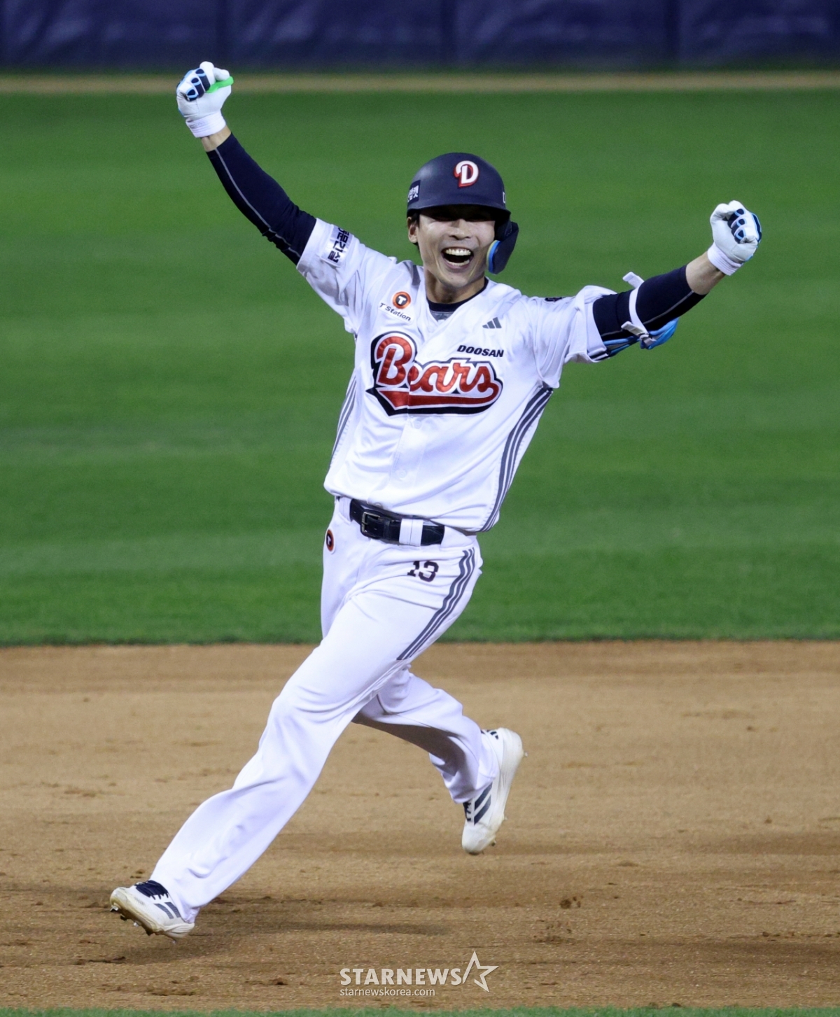 Doosan's Lee Yu-chan celebrates after hitting a walk-off double in the bottom of the 10th extra inning with one out and runners on first and second base.